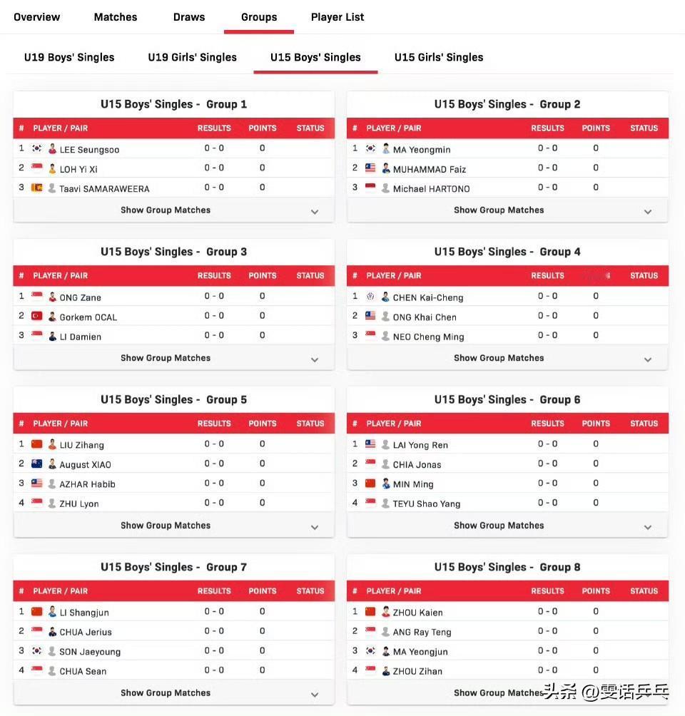 U15男单第一阶段分组:2.25 【Group 1】李承洙🇰🇷、劳意喜🇸🇬、塔维·萨马拉维尔🇱🇰 【Group 2】马渶旻🇰🇷、穆罕默德·法伊兹🇲🇾、迈克尔·哈托诺🇮🇩 【Group 3】王泓元🇸🇬、高尔基姆·奥卡🇹🇷、李奕泽🇸🇬 【Group 4】陈凯程(中国台北)、王锎晨🇲🇾、NEO Cheng Ming🇸🇬 【Group 5】刘子航🇨🇳、August XIAO🇳🇿、阿扎尔·哈比卜🇲🇾、ZHU Lyon🇸🇬 【Group 6】赖勇仁🇲🇾、CHIA Jonas🇸🇬、闵鸣🇨🇳、TEYU Shao Yang🇸🇬 【Group 7】李尚峻🇨🇳、蔡杰仁🇸🇬、孙在英🇰🇷、CHUA Sean🇸🇬 【Group 8】周凯恩🇨🇳、ANG Ray Teng🇸🇬、马渶晙🇰🇷、周梓涵🇸🇬