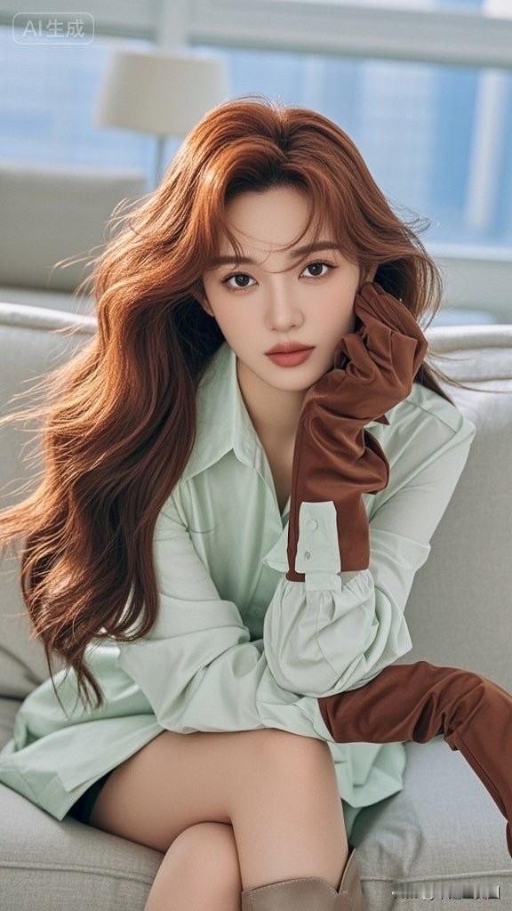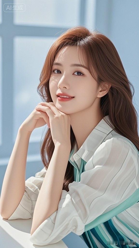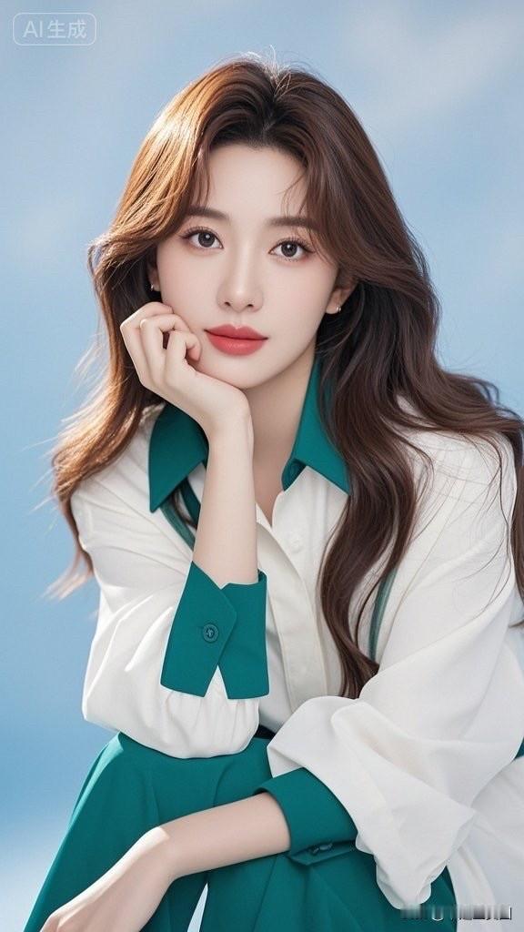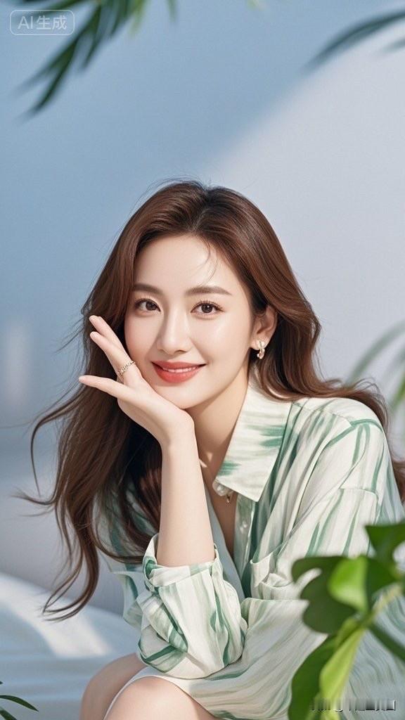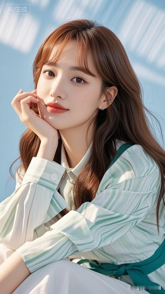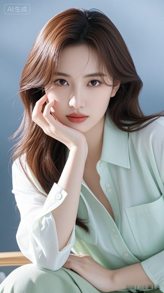 温柔甜美的少女,浅绿色衬衫,自然妆容,清新动人。