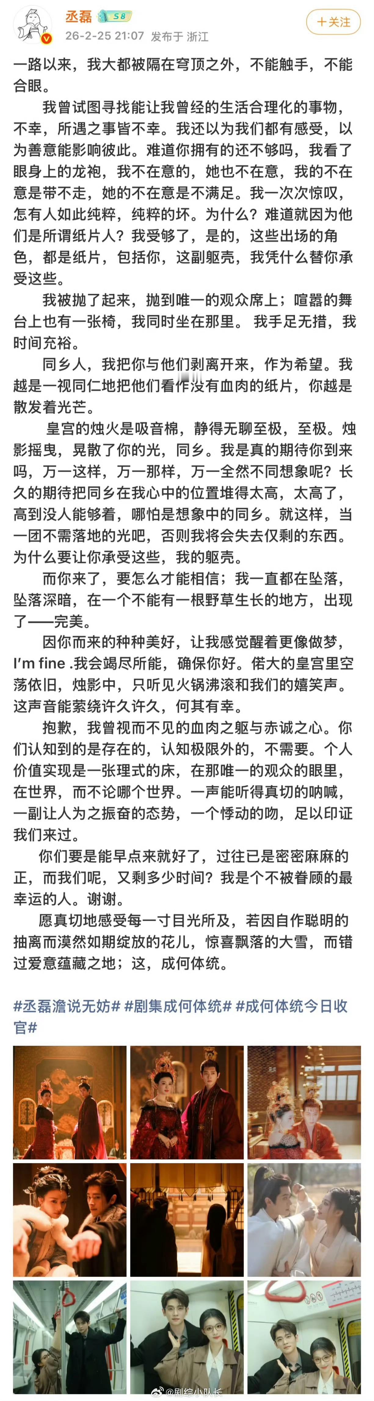丞磊的117天32集800字剧集成何体统 117天拍摄,32集演绎,800字深情。丞磊用一组数字串起了和澹总的全部缘分。观众追了20天,他活了一百多天。这种沉浸式的投入,让澹总有了血肉和灵魂。