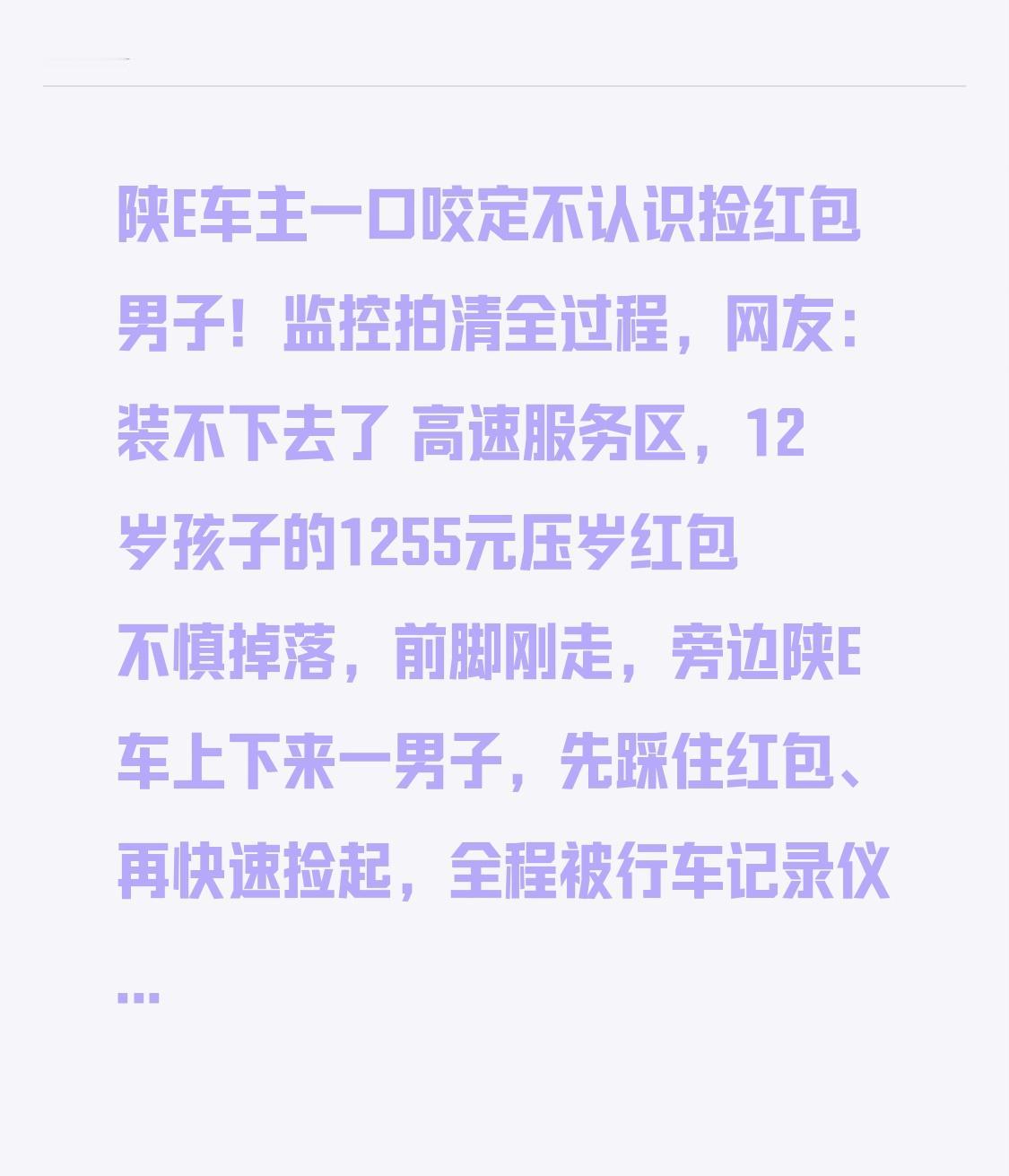 陕E车主一口咬定不认识捡红包男子!监控拍清全过程,网友:装不下去了 高速服务区,12岁孩子的1255元压岁红包不慎掉落,前脚刚走,旁边陕E车上下来一男子,先踩住红包、再快速捡起,全程被行车记录仪拍得一清二楚!失主聂女士当场气炸,立马报警,可警方联系上陕E车主时,对方轻飘飘一句:我不认识捡红包的人。 这回应一出,全网直接炸锅!聂女士当场反驳:视频里男子和车上人聊过天,衣服款式都和副驾一致,明显就是同车人!车主这是想撇清关系、包庇到底? 更让人无语的是,面对清晰监控、目击者证词,甚至警方找到同款外套,涉事男子依旧死不承认,反复摇头说“不是我、不认识”,睁眼说瞎话的样子,比捡钱更让人膈应。这哪是不认识,分明是揣着明白装糊涂,想把孩子的压岁钱昧下来! 有人说不就一千多块钱,至于吗?可这不是钱的事,是人品与底线!那是孩子攒了好久的新年红包,是长辈的心意,不是天上掉的馅饼。拾金不昧是从小就懂的道理,如今监控铁证在前,却靠装傻抵赖,占小便宜丢大格局,实在丢人。 目前警方已介入调查,真相很快水落石出。一时贪念换全网围观、信誉扫地,值得吗? 做人别贪小便宜,别丢良心。钱没了可以再赚,人品坏了再也补不回来。愿我们都守住底线,不欺弱小、不昧横财,坦坦荡荡过日子。你觉得车主是真不认识,还是故意包庇?评论区聊聊!