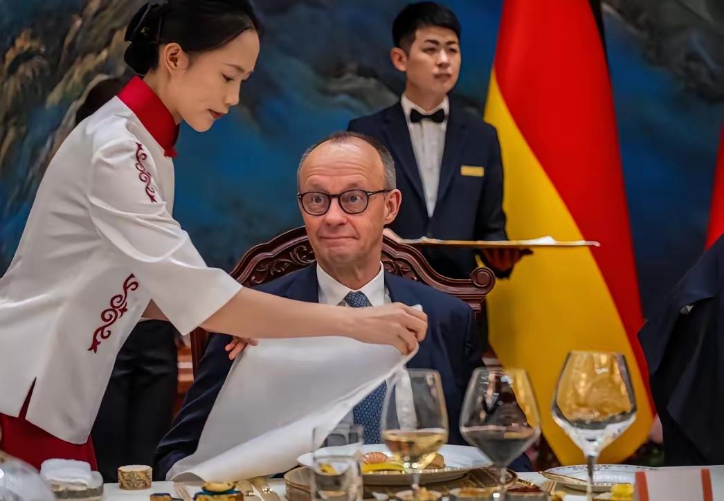 德国总理访华第一天出席北京国宴,2月25日默茨出席完活动后参加北京欢迎宴也是国宴,只见餐桌上放着四个杯子,分别是三个高脚杯一个玻璃杯。 餐桌上的杯子抢镜! 哈哈,西餐伺酒礼仪,分别是白葡萄、红葡萄、餐后甜酒和矿泉水。从左到右:水杯,白葡萄酒杯,红葡萄酒杯,万能杯(一般是果汁或饮料) 这女士在宴会上尤其亮眼 ​为默茨总理服务的这位女士,身穿红白相间的彩色礼仪服,颜值与身材颇佳,仪态端庄沉稳,神情自然优雅,彰显出东方美女的风彩和气质,让外宾们眼前一亮,留有深刻难忘的印象! ​​默茨总理表示:“柏林与北京相隔近7500公里。多年来我们一直很乐于跨越这段距离。对我而言,维护并深化我们的外交和经济关系十分重要。 为实现这一目标,我们需要开放的对话渠道。”