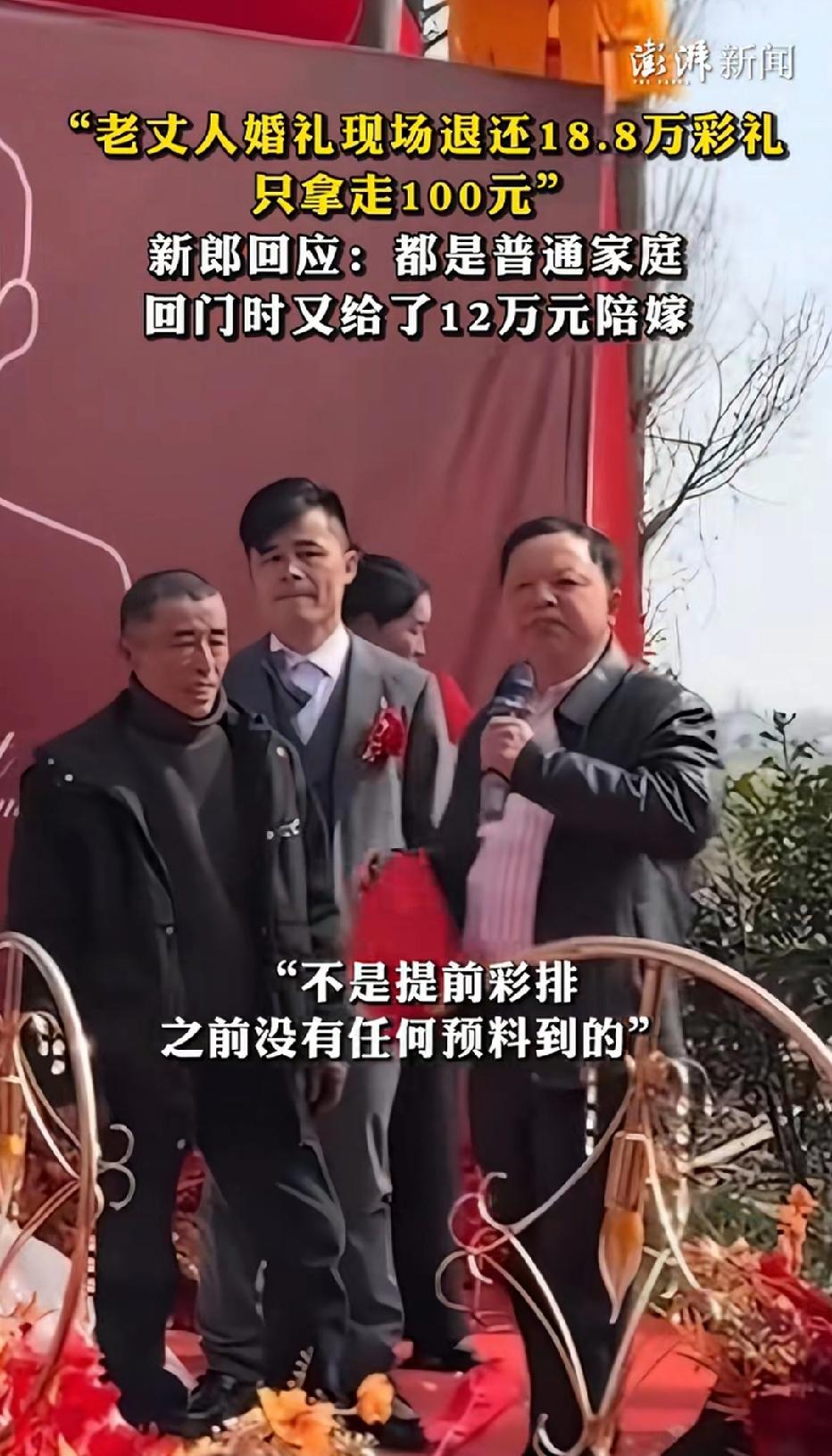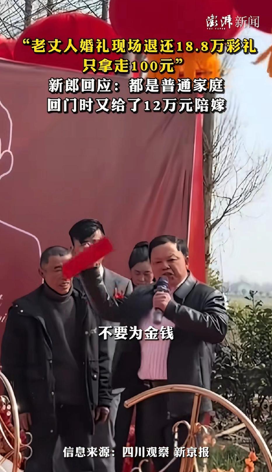 近日湖南益阳,一婚礼现场,老丈人当场退还了女婿18.8万的彩礼钱,只拿走了100元,老丈人当时在现场是这样说的! 老丈人表示:奉劝当代的年轻人不要被金钱蒙蔽了自己的婚姻!18.8万的彩礼我退回去了,象征性地拿走100元彩礼钱!现场亲友们为其鼓掌喝彩!女婿事后表示:双方都是普通家庭,回门的时候,岳父岳母还给了12万的陪嫁,这让他很是感动!不仅退还了18.8万的彩礼,还额外赔嫁了12万! 生活中,有多少人的婚姻在谈到彩礼的时候,因为双方谈不妥而分道扬镳,被金钱拆散的情侣更是数不胜数!你支持事件中老丈人的做法吗?