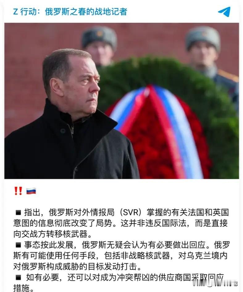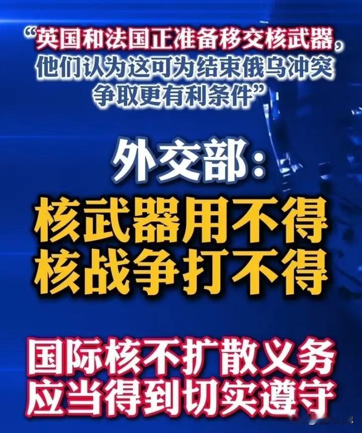 俄乌战争现逆转!英法两国动用核武杀手,竟拟向乌克兰移交核武器 ,俄罗斯警告,如果西方向乌克兰提供核武器,俄罗斯有可能使用任何手段做回应,包括使用战术核武器对构成威胁的目标进行打击。恫吓核大国迫使俄罗斯就范,显然是十分荒谬可笑的,火上浇油核战争打不得。 2月25日,中国外交部发言人毛宁在例行记者会上,回应英法拟向乌克兰移交核武器的提问,重申中方“核武器用不得、核战争打不得”的一贯主张,呼吁遵守核不扩散义务并推动俄乌和平谈判。 持续四年有余俄乌战争,唯有双方在遵守核不扩散义务前提下,国际社会积极斡旋,促使双方走向最终实现和平的谈判桌,这才是应有之道,并非耸人听闻,任何一方的核威胁核讹诈,最终不但不会让俄乌走向和平,必将給全球人类带来灭顶之灾! “核战争用不得,核战争打不得”!中国以负责任大国态度,向世界发出人类最强音,不拥核的乌克兰一旦接过别人递过来核按钮,势必遭受核大国俄罗斯灭国之灾!而且参与相关国家也必定难以幸免于难。这也是全世界人民不愿看到的!