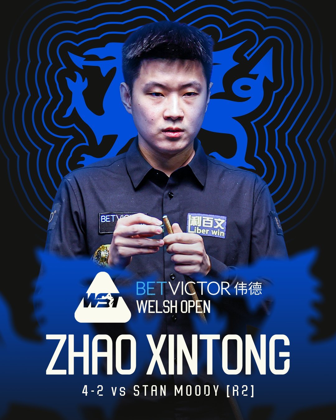 斯诺克威尔士公开赛32进16轮,赵心童4-2战胜斯坦-穆迪晋级16强。
