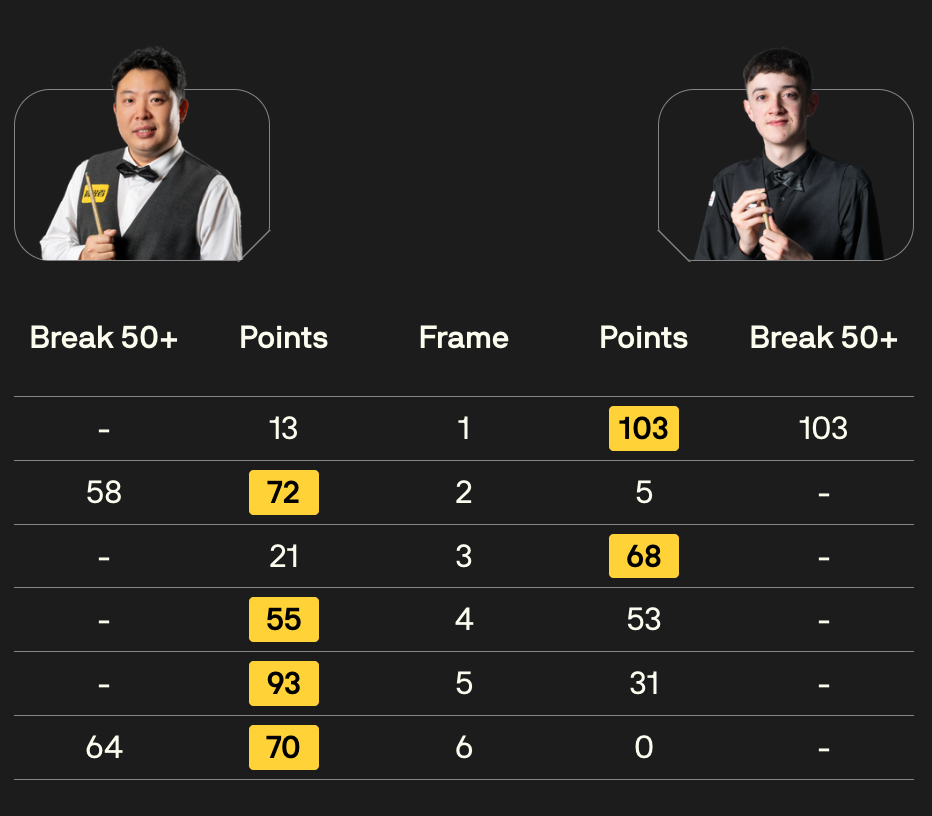 全场比赛,张安达打出单杆58、64分,利亚姆-普伦打出单杆103分。