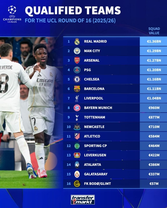 直播吧2月26日讯本赛季欧冠16强全部产生,德转也盘点了16强球队身价榜,具体如下: