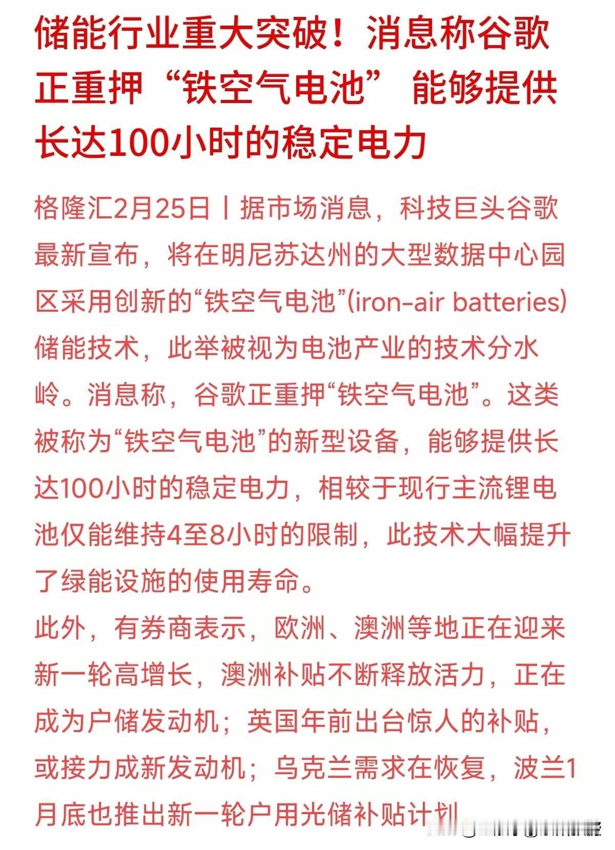 突发!津巴布韦禁锂出口,谷歌押注铁空气电池,这两件大事同时发生或导致全球能源大变局! 始料未及!全球第四大锂生产国突然“断供”!津巴布韦宣布即刻暂停锂精矿及原矿出口,比原定2027年的禁令足足提前了1年。这对在当地砸下数十亿美元的投资的中资矿企,华友钴业、盛新锂能来说,无疑面临着“二选一”,要么砸钱建本地冶炼厂,要么面临供应链断裂。 消息一出,全球锂市瞬间震动。依赖津巴布韦原料的海外精炼企业首当其冲,美股锂矿股却逆势走强。 而就在同一天,谷歌宣布在数据中心押注“铁空气电池”,可提供100小时稳定电力,直接挑战锂电池的统治地位。 一边是资源国收紧出口,一边是科技巨头另辟蹊径,锂价和储能技术的双重变局,正在重塑全球能源版图。 当资源卡脖子遇上技术破局,谁能在这场能源革命中笑到最后?