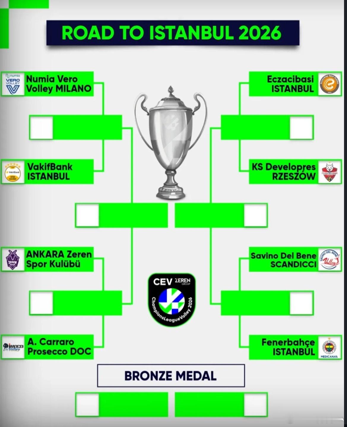【25/26赛季欧冠女排八强完整出炉】米兰🆚瓦基弗银行泽仁体育🆚科内利亚诺伊