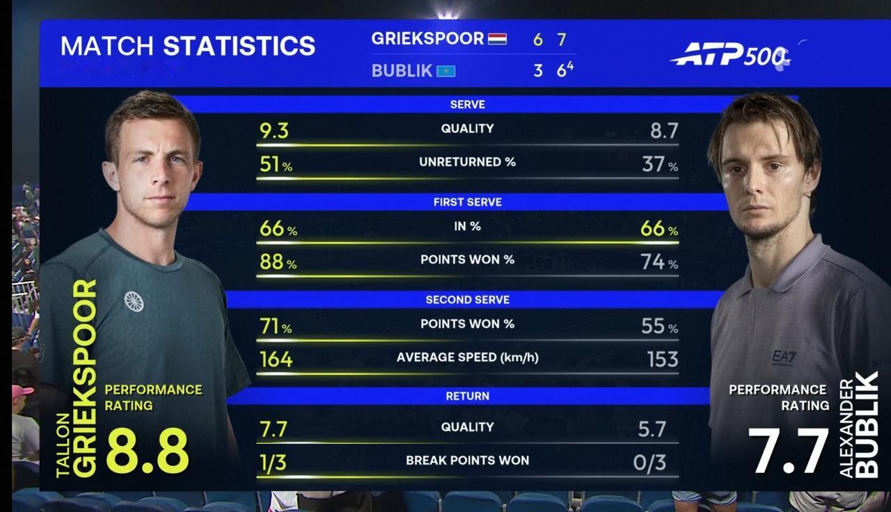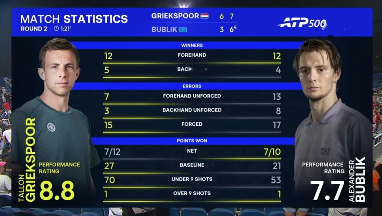 疯子布勃里克迪拜站第二轮惨遭格里克斯普尔淘汰 北京时间2026年2月25日晚,ATP500迪拜站第二轮,疯子布勃里克以0:2的比分不敌格里克斯普尔,止步第二轮。 具体比分为3:6、6(4):7。 疯子布勃里克截至2026 年,职业生涯共夺得9个ATP单打冠军。2026年1月,他凭借香港站夺冠升至ATP世界第10位,成为哈萨克斯坦历史上首位进入TOP10的男子球员。 格里斯普尔来自荷兰,职业生涯尚未赢得任何ATP巡回赛单打冠军,仅拥有3个挑战赛单夺冠纪录,最高世界排名为第21位(2025年),是当前荷兰男网最具稳定性的中坚力量。 相对而言 ,布勃利克实力占优。 整场比赛,布勃里克共轰出12记ACE,比对手少1记;一发得分率73.81%,比对手低近4个百分点;二发得分率54.55%,比对手低近17个百分点;共拿到3个破发点,与对手持平;总得分53分,比对手少17分。 疯子布勃里克没有打疯,状态低靡,被对手压制,最终被淘汰出局,有点出乎意外,算是爆了个冷门。