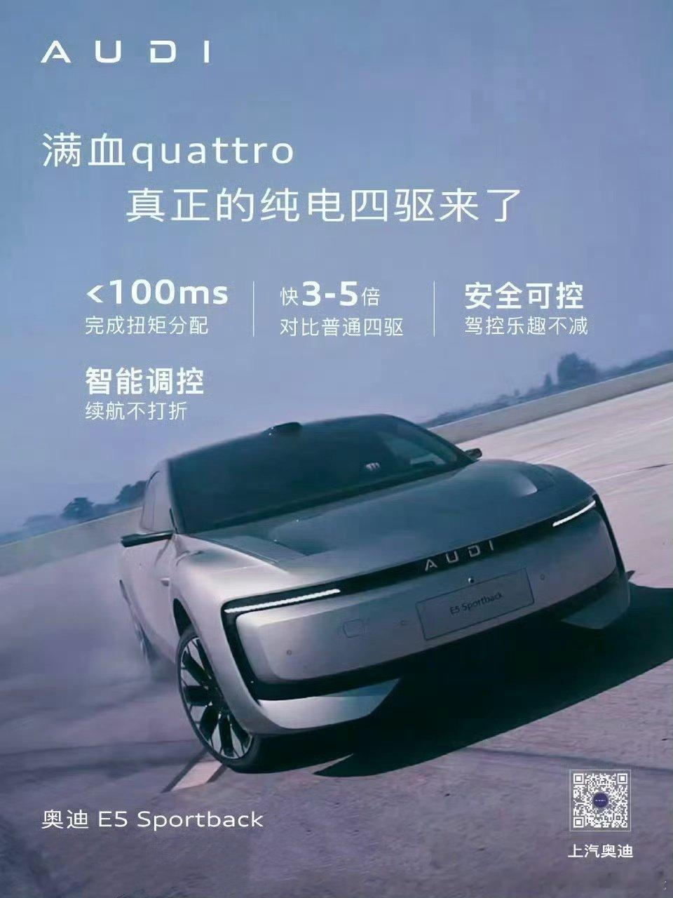 奥迪E5开年抢先优惠20.59万我是一个很极端的人,我觉得如果一辆车不能在城中村的窄路穿梭,不能在赛道上飞驰,今年我情愿给家里换一套智能设备,不换车了。问题是现在真的有一辆跑过赛道、玩过冰雪,又是BBA,而且直降3万,比特斯拉model3还便宜,当年度猎装轿跑奥迪E5也开始讲性价比的时候,那就有点无敌了。入门即满配的先锋版直接20.59万,quattro版23.99万更是史上最具性价比的奥迪四驱,圈外人都震惊的程度——第一梯队的Momenta辅助驾驶标配激光雷达、宁德时代100度大电池能跑773公里,800V平台充电10分钟能跑380公里,59英寸大屏搭载豆包大模型的奥迪助手,全场景覆盖~这价格,放年前你敢信?再说个细节:德国总理今天刚带商务团访华,而奥迪就打响了开年价格第一枪,这波操作明显是战略动作——用价格和技术,向中国市场表明决心,奥迪正在用最大诚意拥抱中国用户!(
