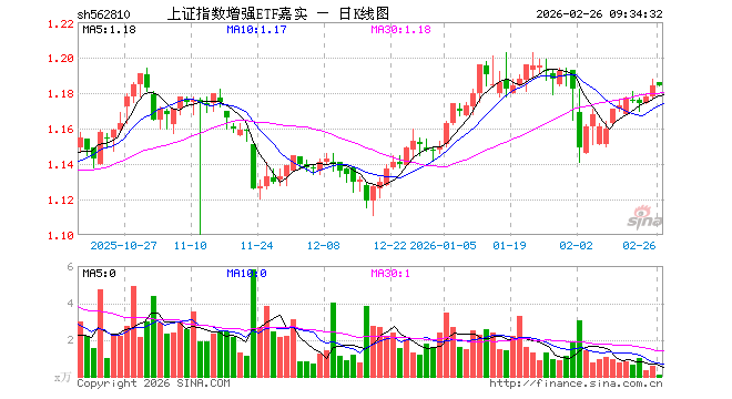 2月26日,上证指数增强ETF嘉实(562810)开盘涨0.17%,报1.186元。上证指数增强ETF嘉实(562810)重仓股方面,中国石油开盘跌0.64%,工商银行涨0.14%,农业银行跌0.15%,贵州茅台跌0.34%,工业富联涨0.02%,紫金矿业涨0.66%,中国人寿涨0.00%,中国银行涨0.00%,中国电信涨0.00%,招商银行涨0.05%。