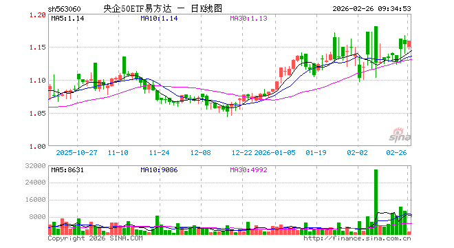 2月26日,央企50ETF易方达(563060)开盘跌0.35%,报1.150元。央企50ETF易方达(563060)重仓股方面,长江电力开盘涨0.04%,中国船舶跌0.39%,中国神华涨0.00%,中国石油跌0.64%,海康威视跌0.19%,中国建筑涨0.20%,中国电信涨0.00%,中国铝业涨1.63%,中远海控涨0.27%,中国中免跌1.07%。
