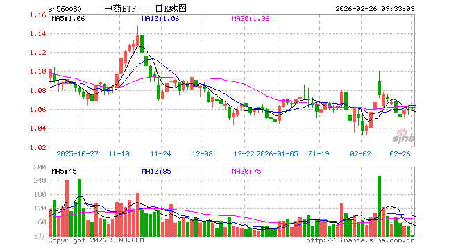 2月26日,中药ETF(560080)开盘跌0.19%,报1.059元。中药ETF(560080)重仓股方面,云南白药开盘涨0.00%,片仔癀跌0.01%,同仁堂跌0.03%,东阿阿胶跌0.40%,华润三九涨0.00%,吉林敖东涨0.11%,白云山涨0.08%,以岭药业涨0.06%,达仁堂跌0.23%,众生药业跌0.10%。