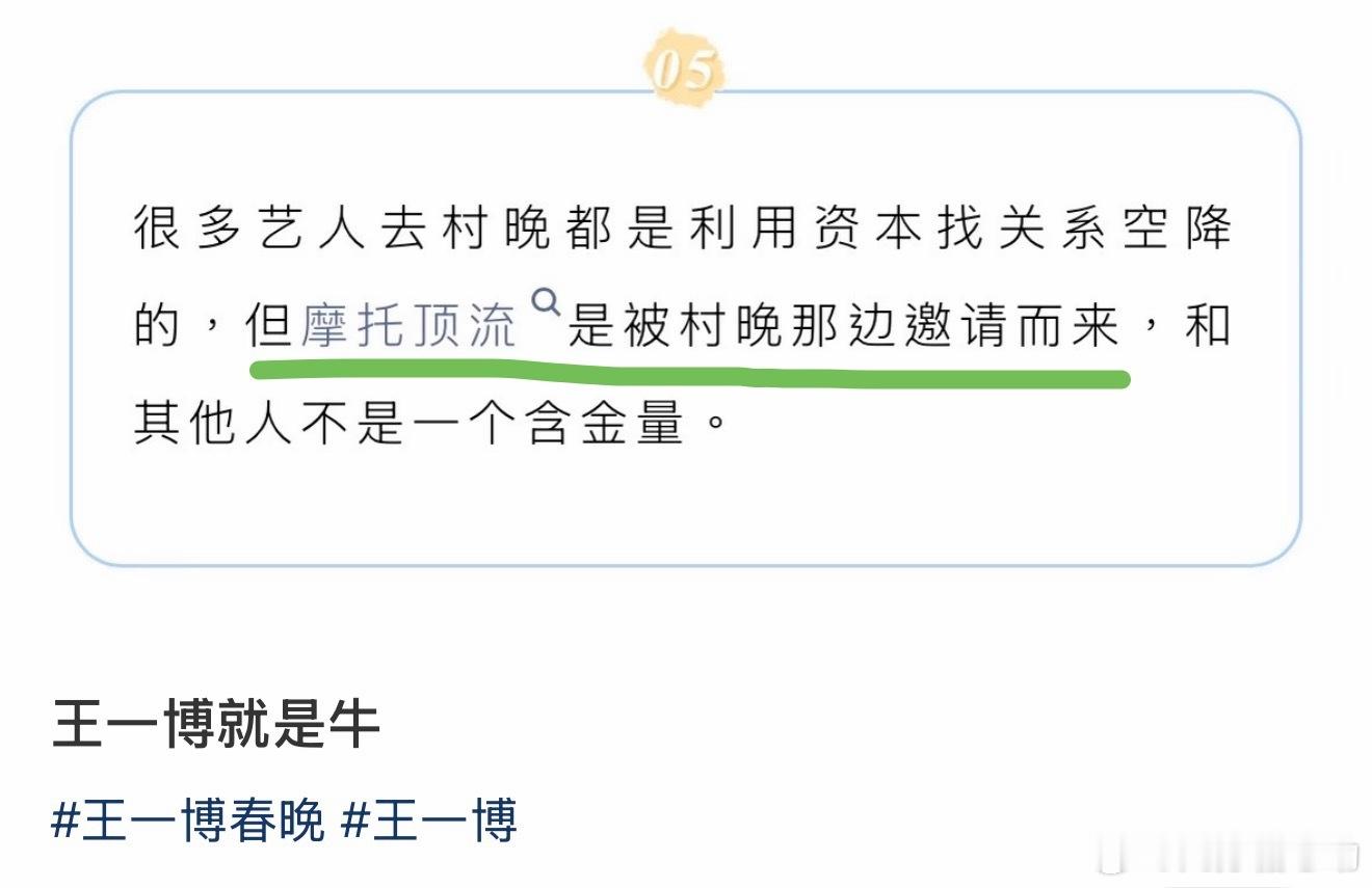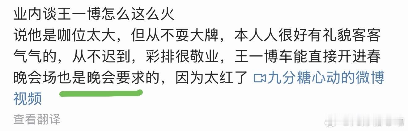 之前春晚消息还没明确的时候有爆料春晚直接邀请王一博空降还不敢多说,只能说非官宣不约。。。现在看当初爆料全是真的一点都没夸张。歌是量身定做的,车直接开进去是春晚要求的,彩排也是不会被刷掉的,纯靠王一博自己红,就是这么大的影响力,事实证明春晚的选择也是正确的,舞台好看又出圈,口碑还好