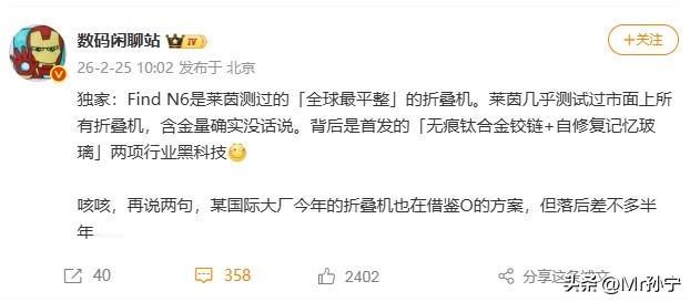折叠屏变平板?OPPO Find N6凭两大黑科技让国际大厂慌了! 开工第一爆,OPPO直接甩出王炸!Find N6海报那句“一马平川”,明摆着告诉你:折痕?看来是丝毫不存在的。 现在数码圈都在传,这机子拿到了莱茵“全球最平整”认证,含金量简直爆表。更狠的是外观泄密,哈苏四摄模组依旧霸气,据悉这次直接上了两亿超清像素,妥妥的折叠影像天花板。 但这都不是最关键的,真正的护城河是两项首发黑科技:“天穹记忆玻璃”能自我修复划痕,配合“无痕钛合金铰链”,直接把屏幕平整度拉到新高度。 有消息灵通人士透露,某国际大厂今年的新品都在紧急借鉴这套方案,可惜技术迭代得花半年,只能跟在后面吃灰。说实话,感觉OPPO这波不仅是秀肌肉,更是在重新定义折叠屏的技术壁垒。 当别人还在卷参数,人家已经靠硬核专利筑起了高墙。这哪里是发新机,分明是给行业立了新规矩。想体验真正“无痕”的折叠旗舰?Find N6这波必须蹲守,毕竟能让对手抄作业都赶不上的产品,市面上可真不多见。