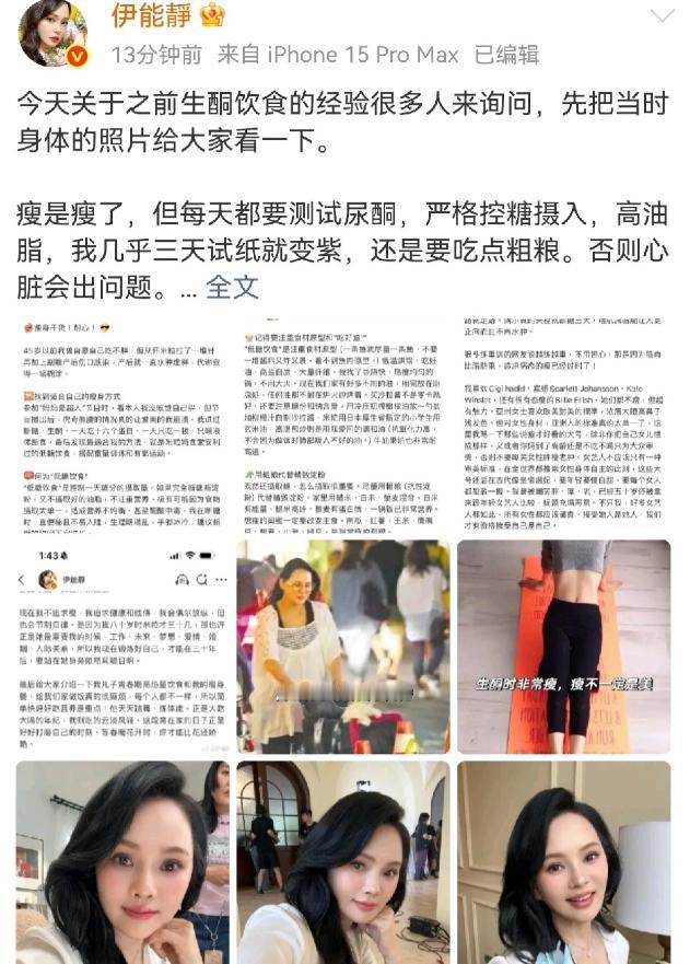 伊能静,高调发文! 2月25日,伊能静突然冲上热搜,她在社交平台晒出600字长文,字里行间都是反对盲目减肥,并努力劝诫大家应该以健康为重,这到底是怎么回事呢?   作为常年活跃在公众视野中的女艺人,伊能静从不避讳对自身状态的要求,她坦言,保持良好的外在形象,是对自己工作的负责,而这份负责,曾让她陷入了对“极致纤瘦”的执念。   为了在镜头前呈现更纤细的身材,她毅然选择了生酮饮食,这是一种以高油脂、极低碳水为核心的极端饮食模式,一旦开始,就意味着要彻底告别米饭、面条等所有碳水化合物。   极端减肥的代价,比她想象中更沉重。   长期缺乏碳水,让她的身体变得极度虚弱,稍微活动就会感到无力,气色也一落千丈,失去了往日的红润;   更让她揪心的是,心脏健康也受到了威胁,偶尔会出现不适,这让她第一次意识到,自己追求的“美”,正在一步步伤害自己的身体。   除此之外,过度减重还让她的脸部状态急剧下滑,胶原蛋白大量流失,皮肤变得干瘪松弛,出现了明显的垮态,反而违背了她想要保持好状态的初衷。   没有丝毫犹豫,伊能静果断放弃了生酮饮食,她明白,再极致的纤瘦,也抵不过健康的重要性。   她开始重新调整自己的饮食方式,不再追求“绝对戒糖”,而是学会了科学控糖——她清楚地知道,控糖不等于戒糖,关键在于平衡,在于控制每天糖分的摄入量,而不是一味地禁止。   如今的她,饮食变得温和而灵活。   她把日常吃的精致淀粉,全部换成了杂粮饭、藜麦、鹰嘴豆等粗粮,既能保证身体所需的能量,又不会给身体带来负担;   水果方面,她优先选择蓝莓、野莓、小红莓等莓果类,这类水果富含花青素,对身体更友好。   她也不再刻意回避甜食,和孩子一起旅行时,会偶尔吃一支冰淇淋、一块蛋糕,享受生活的小美好;   如果遇到大餐放纵的情况,她也不会过度焦虑,而是在第二天安排一份轻食补救,沙拉搭配三文鱼,再加上藜麦和牛油果,简单又健康。   这种温和的饮食方式,让她的体重逐渐稳定在104斤左右,身体也慢慢恢复了往日的活力,气色变得红润,脸部的饱满感也重新回来,整个人的状态比86斤时更显年轻、更有精神。   在长文里,伊能静还聊起了自己对年龄和美的看法。   58岁的她,没有刻意追求所谓的“少女感”,反而直言不讳地表示,自己非常热爱当下的年纪,一点也不想回到18岁。   她觉得,岁月留下的每一道皱纹,都是人生的印记,都是值得珍惜的礼物;   每个年龄段的女性,都有属于自己的独特魅力,不必强行凹“少女感”,也不必盲目追求过瘦的身材。   我始终觉得,伊能静的这份分享,比任何减肥技巧都更有意义。   当下,娱乐圈“白幼瘦”的审美风气盛行,很多普通女生被这种单一的审美绑架,跟风尝试节食、断碳等极端减肥方法,陷入了严重的身材焦虑,甚至不惜伤害自己的身体。   伊能静选择公开自己的惨痛经历,不是为了博眼球,而是想用自己的亲身试错,给所有跟风减肥的人敲一个警钟。   我们真的不提倡身材焦虑,更要明白,“少女感”从来都不是给熟龄女性的赞美,健康与活力,才是一个人最美的状态,而接纳自己、热爱自己,才是对抗焦虑最好的方式。   今天的分享到这里就结束了,大家对此事有何看法,欢迎在评论区留言和讨论,感兴趣的可以点击头像加关注,我将每日更新优质内容,我们下期见。