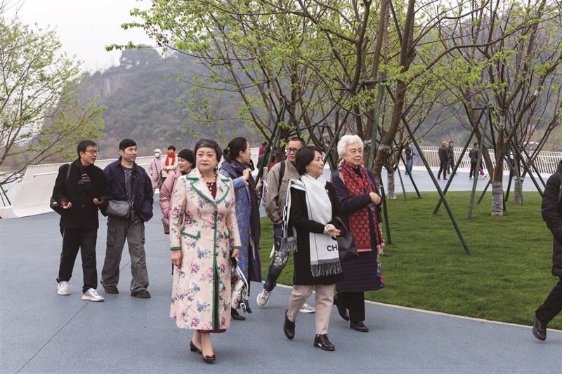 上午10时许,文艺家们步入园区。仙湖碧波荡漾,湖心三岛依“一池三山”的经典手法布局,勾勒出“虽由人作,宛自天开”的东方园林意境。沿着湖岸线前行,园博园特色景观渐次铺展。尽管目前中国馆、郭公阁及34个城市展园尚未对外开放,但园博园清晰的山水骨架与浓厚的人文气韵给艺术家们留下了深刻印象。大家一路走、一路看,从专业角度对景观细节、动线设计及未来运营提出了意见建议。