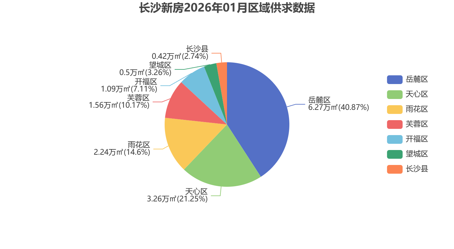 最后看区域分布。岳麓区成交面积占比40.8%,遥遥领先;天心区、雨花区分别占21.2%和14.6%。