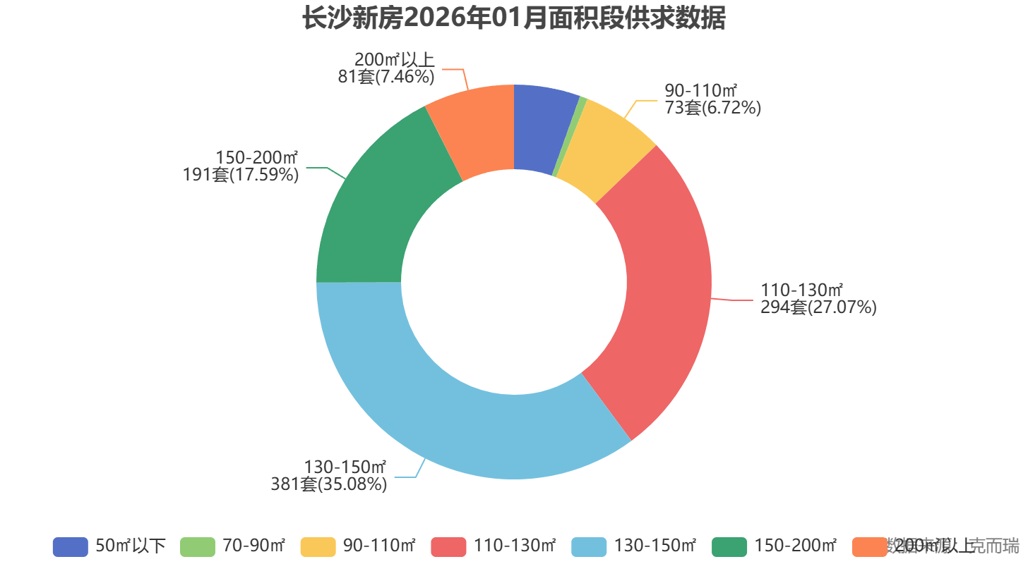 再看成交结构。2026年1月,长沙新房成交中,建面130至150㎡户型成交381套,占比最高;其次为建面110至130㎡,成交294套。