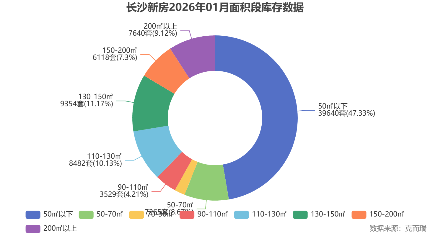 首先看库存结构。截至2026年1月,长沙新房库存中,建面130至150㎡面积段库存套数最多,达9354套;其次是建面200㎡以上大户型,库存7640套。