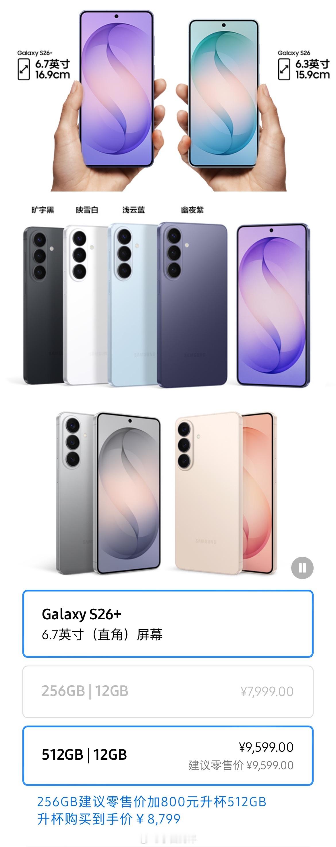 - 三星S26+(6.7''):12+256GB售价7999元(+800可升杯512GB),12+512GB版9599元;
