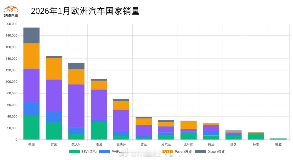 2026年1月,欧洲整体新车注消了达到96.1万辆,下降3.5%。欧盟本体销量为799,625辆,英国144,127辆,德国(193,981辆)、意大利(141,993辆)、法国(107,157辆)、西班牙(73,103辆)构成核心汽车市场。
