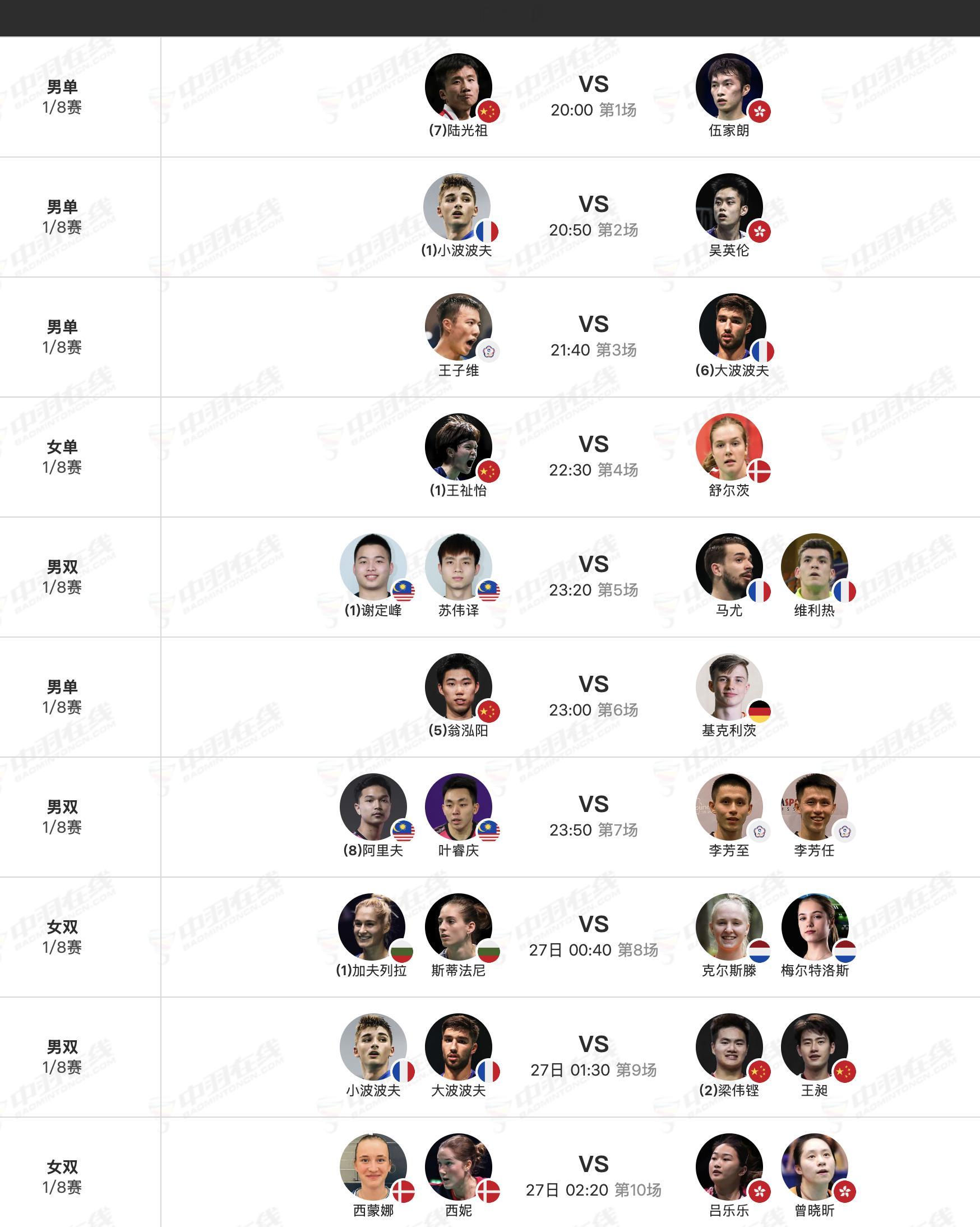 【1号场地】1、陆光祖🇨🇳 vs 🇭🇰伍家朗4、王祉怡🇨🇳 vs 🇩🇰舒尔茨6、翁泓阳🇨🇳 vs 🇩🇪基克利茨9、梁伟铿/王昶🇨🇳 vs 🇫🇷波波夫兄弟