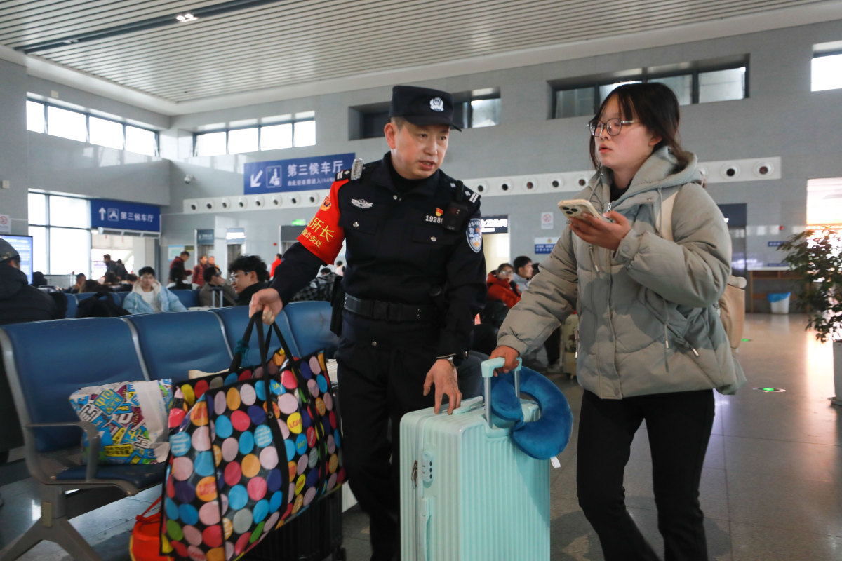 信阳火车站,吴刚在执勤时帮助行李较多,出行不便的旅客,钟鹏宇摄