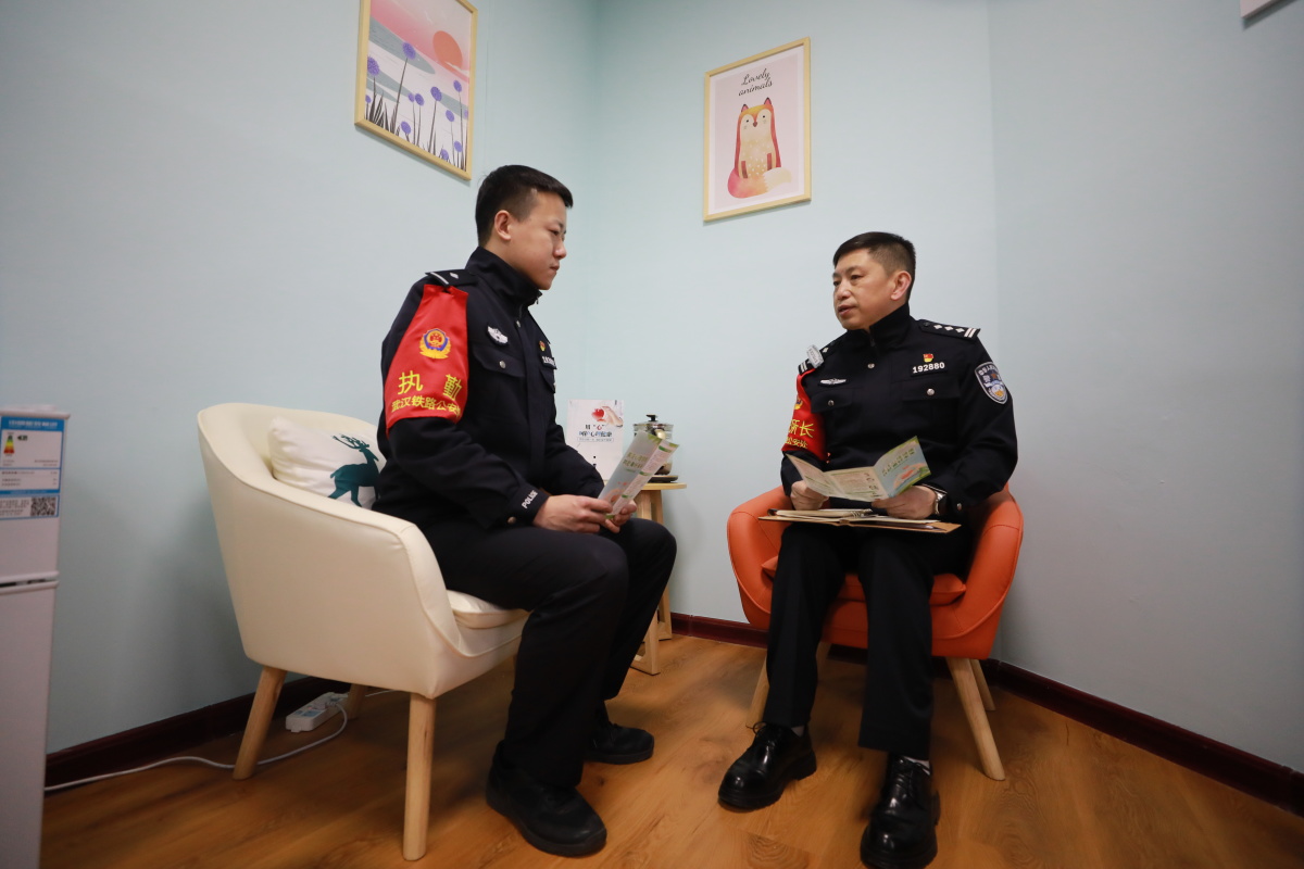 信阳站派出所,所长吴刚与民警开展谈心谈话,钟鹏宇摄