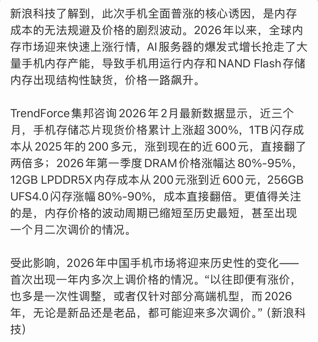 中国手机行业将迎来全面涨价2026年中国手机市场旗舰机涨幅将突破30%,同配置机型比2025年贵300-1000元,大存储版本甚至贵2000元,而3月后发布的新品,涨幅将在此基础上进一步扩大。国补覆盖不了涨价成本,看好哪款手机早下手。