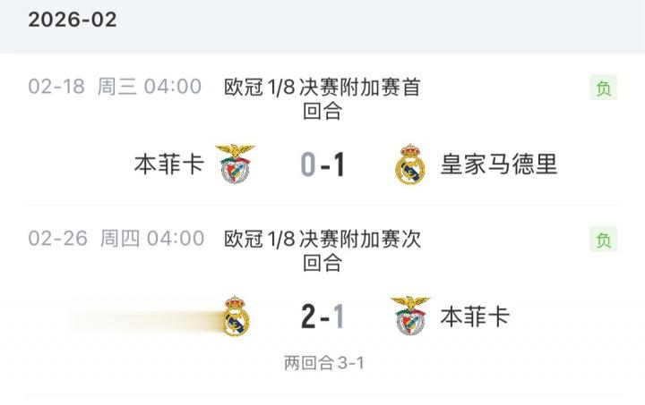 2月26日,欧冠1/8决赛附加赛次回合,本菲卡1-2客负皇马,总比分1-3。