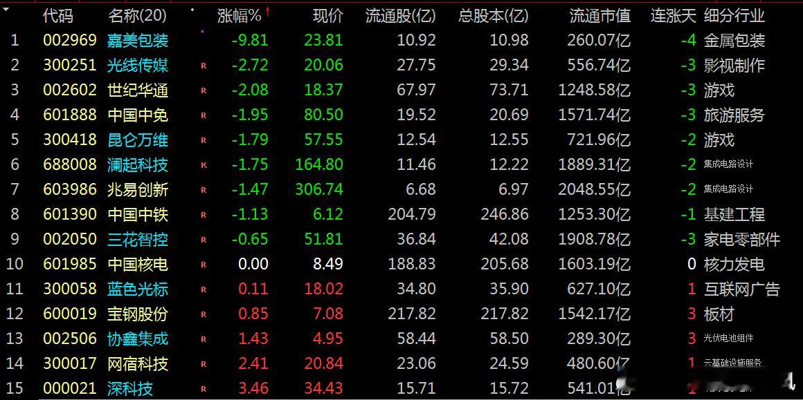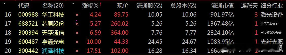 已经按照:列表款式:分别是:涨跌版、现价、流通股、总股本、流通市值、连涨天数、细分行业等排列。