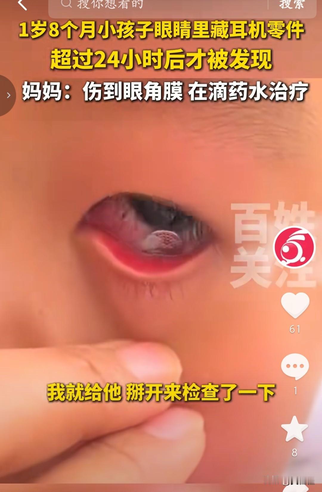 真的太吓人了,幸好及时取出来了!提醒所有宝爸宝妈:家里再小的东西,都别随手乱放! 一个才1岁8个月的宝宝,眼睛里不小心进了耳机小零件,妈妈发现得早,第一时间送医才取出来。医生说已经伤到角膜,孩子现在还在滴眼药水治疗,想想都心疼。 小孩子好奇心强,什么都爱抓、爱往嘴里塞、往脸上蹭,耳机塞、纽扣、电池、小珠子、硬币、乐高颗粒、别针……这些不起眼的小物件,对宝宝都是致命隐患。一旦呛进气管、塞进鼻孔、戳到眼睛,后果不堪设想。 带娃真的不能有半点侥幸。家里杂物及时收纳,危险小物件放到孩子够不到的地方,多一分细心,就少一分意外。愿每个宝宝都能平平安安、健健康康长大。
