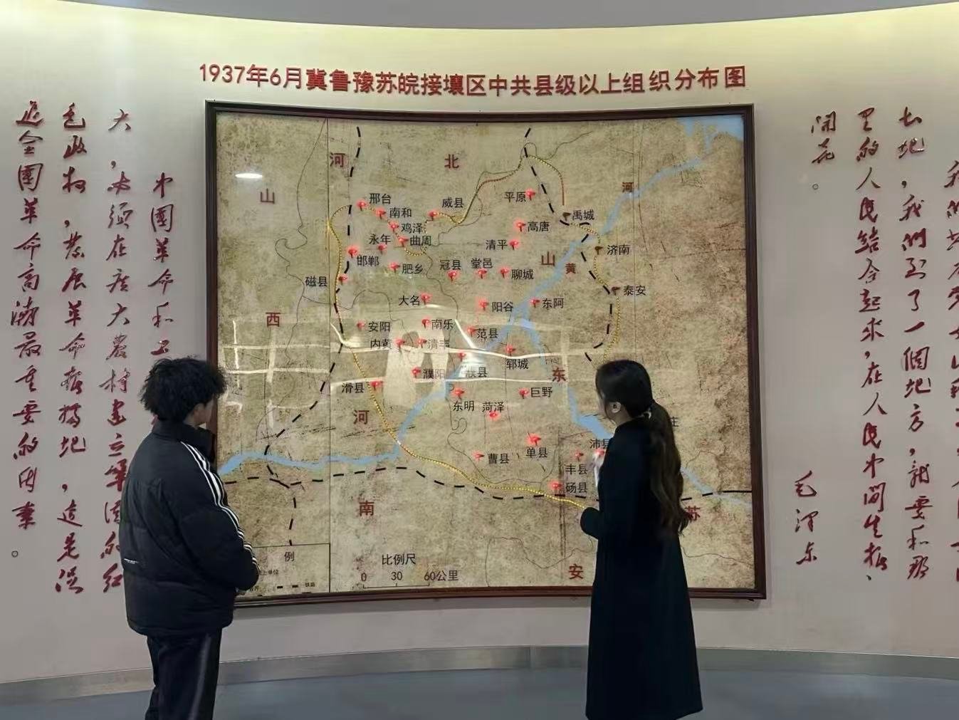 队员们踏入纪念馆广场,江泽民同志亲笔题写的馆名庄重遒劲,馆区占地198亩、绿化面积54000平方米。序厅内,国内最大室内陶版壁画《冀鲁豫边区革命斗争史》铺展,队员们随壁画中蜿蜒黄河水,触摸到边区军民不怕牺牲、前赴后继的革命温度。在“星星之火”展厅,队员们通过成像技术看到早期党组织创建场景,展柜里的《鲁西日报》、锈迹怀表、粗布党旗等文物,诉说着白色恐怖下的坚守,让队员们真切理解了“星星之火”的深刻内涵。