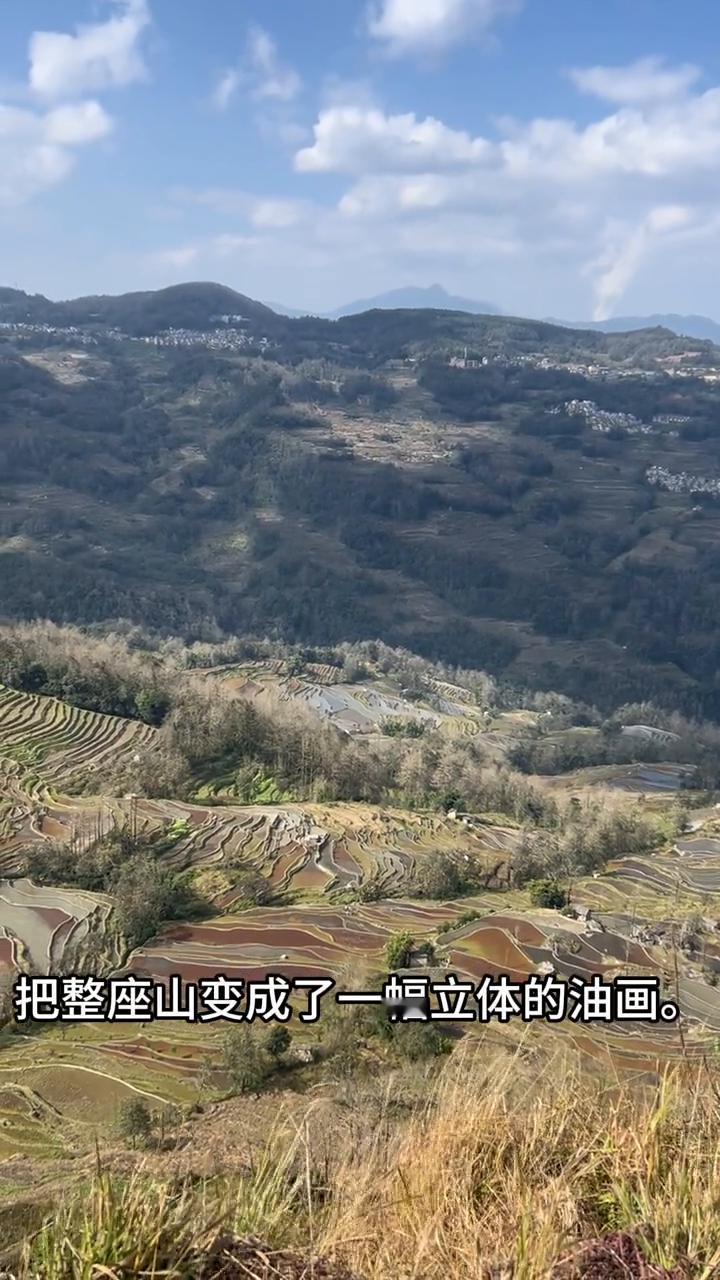 哈尼人智慧与音乐。 各位朋友,今天我要给大家推荐一个元阳梯田里的"秘境"--老鹰嘴五彩梯田。这里没有观景台,也没有成群的游客,是我在当地司机的带领下才找到的一处私藏美景。 当车转过山坳,眼前的景象让我瞬间屏住了呼吸。这些梯田就像被大自然打翻的调色盘,红、橙、黄、绿、蓝,各种色块在阳光下流转,每一道田埂都是哈尼族人用千年时光顺着山势画出的曲线。它们像大地的指纹,又像流动的音符,把整座山变成了一幅立体的油画。 这里的美在于它的纯粹与原始,没有人工的修饰,只有自然的馈赠和人类的智慧。远处的村落点缀其间,仿佛是这幅画卷上的点睛之笔。 如果你也厌倦了人挤人的打卡式旅行,不妨来这里走走,让眼睛沉醉在这五彩的世界里,让心灵在这片古老的梯田中找到最本真的宁静与感动。