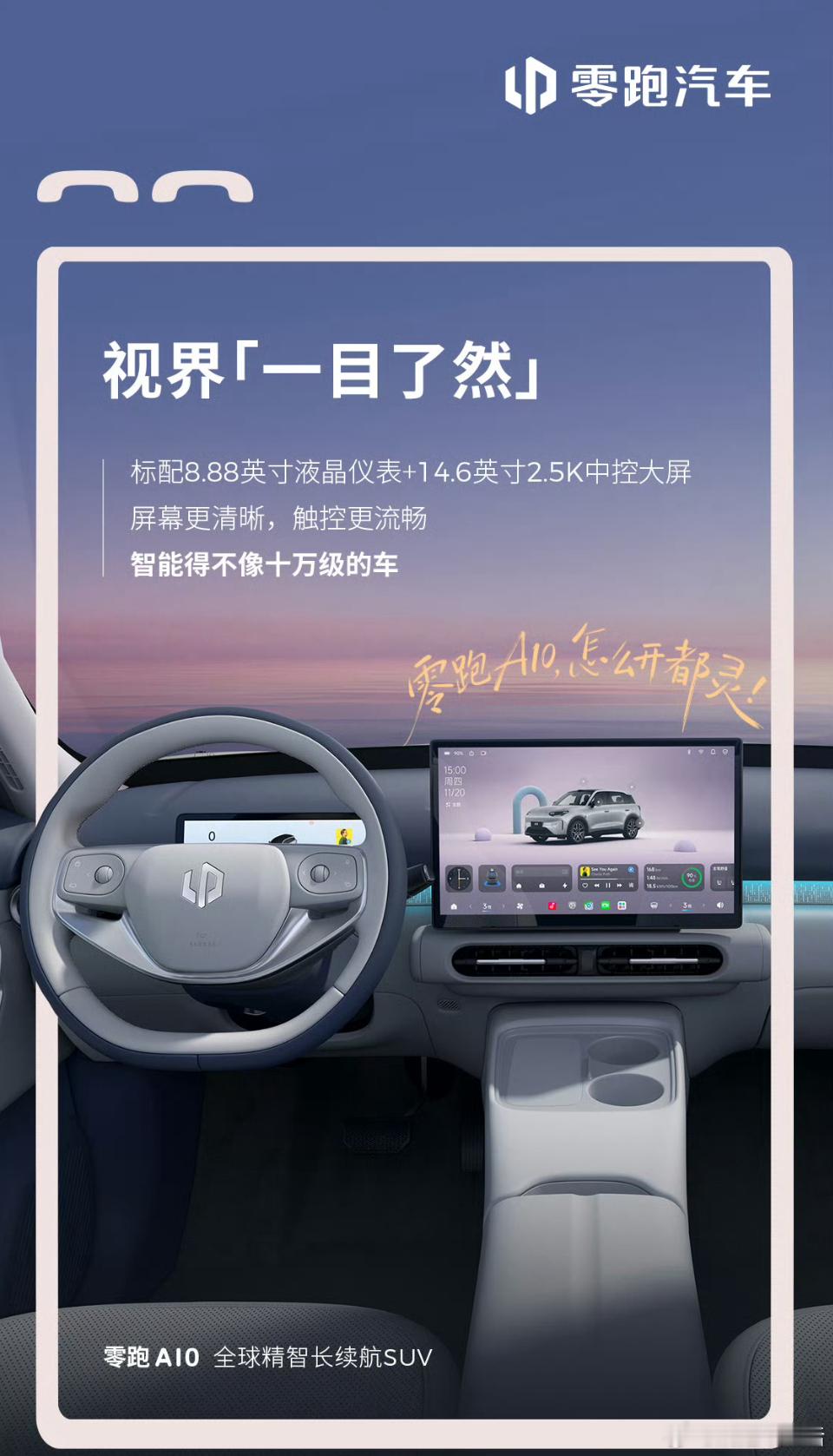 零跑A10 A10内饰官图一出来,我觉得零跑这波很会拿捏年轻人:中控够清爽,14.6英寸2.5K大屏+8.88仪表,氛围灯、无线充电这些也都给到。