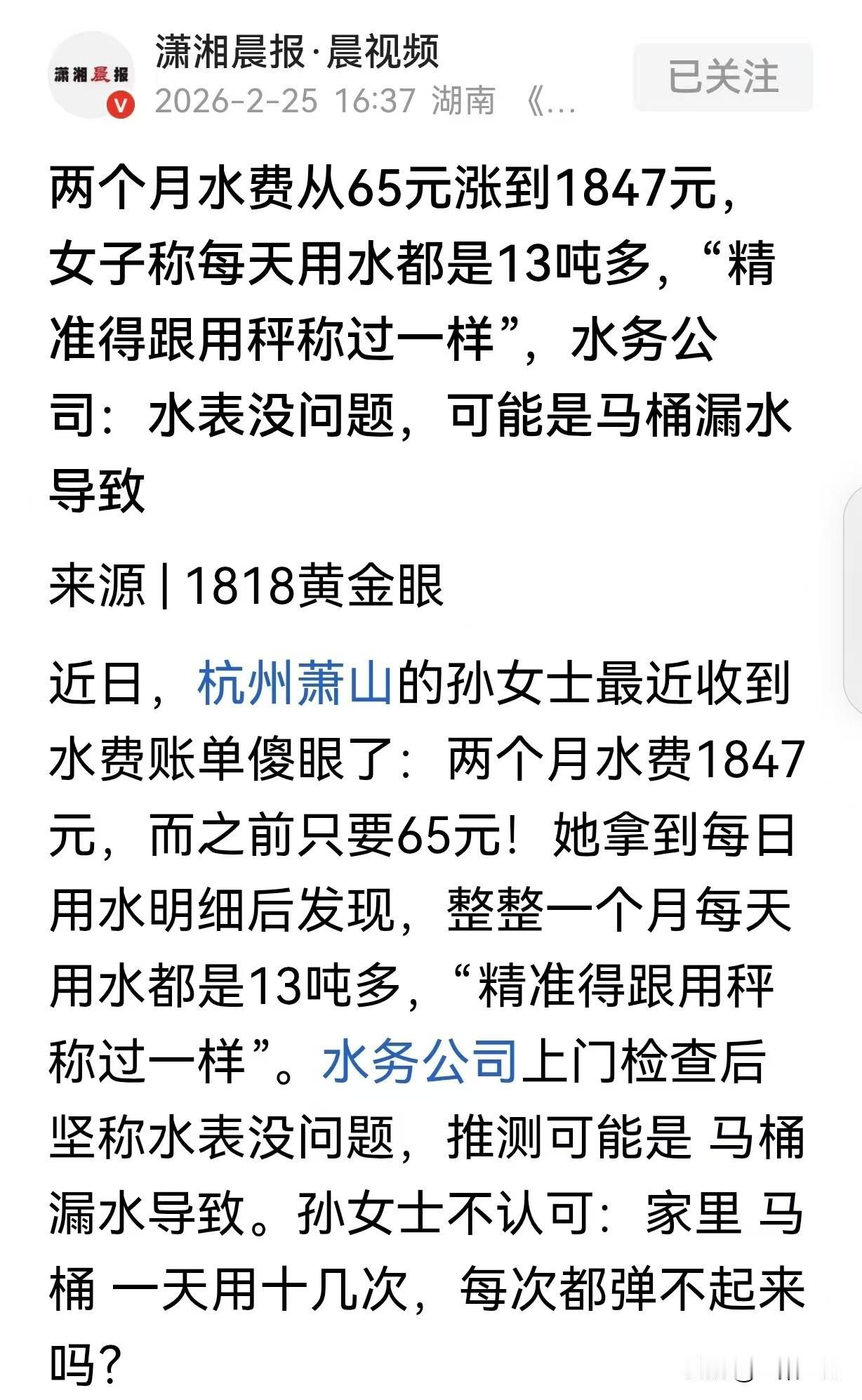 “不可思议!”浙江杭州,一女子收到水费账单傻眼了,2个月竟然1847元,而之前只要65元!她去查用水明细,发现整整1个月,每天用水都是13吨多,精准得跟用秤称过一样,水务公司:水表没问题,可能是马桶漏水。女子:家里马桶一天用10几次,每次都弹不起来吗?网友:最终马桶扛下了所有! 孙女士最近被水费账单弄得一头雾水,心里那叫一个憋屈。 孙女士平时生活规规矩矩,每个月交水费都挺正常。 以往2个月的水费也就65元左右,这在她看来是再平常不过的事儿。 可这次,当她拿到新一期水费账单时,眼睛都直了,上面赫然写着1847元! 这数字跟以往比起来,简直就是天壤之别,把她惊得差点没站稳。 孙女士心里犯起了嘀咕,这水费咋就突然涨了这么多呢? 她赶紧去查用水明细,这一查,更让她觉得不可思议。 明细显示,整整一个月的时间里,每天的用水量都精准地保持在13吨多,就像有人用秤仔细称过一样,分毫不差。 孙女士看着这数据,脑袋里全是问号,这到底是怎么回事啊? 她越想越不对劲,赶紧联系了水务公司。 水务公司很快派人上门检查,工作人员里里外外查看了一番,最后得出结论:水表没问题。那问题出在哪儿呢?水务公司推测,可能是马桶漏水导致的。 孙女士一听这个推测,心里就不乐意了。 她仔细琢磨起来,自己家里马桶使用频率也不算低,一天怎么也得用个十几次。 要是马桶漏水,每次使用后都得弹不起来,那自己平时怎么可能一点都没察觉呢? 而且,如果真是马桶漏水,这漏水量也不该这么精准啊,每天都是13吨多,这也太巧了吧。 孙女士越想越觉得这事儿蹊跷,她决定自己再好好查查。 她把家里所有用水的地方都检查了个遍,水龙头、洗衣机、热水器,一个都没放过,可还是没发现有什么异常。 她又想到会不会是水管出了问题,可自己也不懂这方面的知识,不知道该从哪里下手检查。 这高额水费就像一块大石头,沉甸甸地压在孙女士心头。 她不知道这问题到底出在哪儿,也不知道该怎么解决。每天看着那离谱的水费账单,她心里就直发愁,这日子过得都不踏实了。 她盼着能尽快找到问题的根源,把这事儿弄个水落石出,让自己的生活恢复往日的平静。 有人说,先停掉马桶上水阀门。用之前小时开启。试几天看看水费的变化?我家原来就是,马桶水箱里的塞子不严了,漏水,一个月比平时多一百多。 每日漏13吨水,抵的上普通人家一个月的用水量。马桶漏,每日漏13吨水,漏水量很大,应该听得见漏水声,听不见就奇怪了。水表坏了,远程测控出错。 我家空置房子也遇到过,去校表说是水表没问题,怀疑马桶有隐形漏水点,检查完也不是,又打水务公司电话,他们派人来检查,结果还是水表空转引起的。 孙女士遇到的这事儿着实让人闹心。两个月水费从65元飙升到1847元,每天用水量还精准得离谱,任谁碰到都得懵圈。 水务公司检查后说水表没问题,怀疑是马桶漏水,可孙女士觉得不合理,毕竟马桶使用频率高,要是漏水早该发现了,而且漏水量还这么均匀,实在蹊跷。 从孙女士的角度看,她有理由质疑。 高额水费对普通家庭来说是不小的负担,她积极检查家中用水设备,这种态度值得肯定。 水务公司呢,虽然上门检查了,但仅推测是马桶漏水,缺乏更有力的证据。 毕竟连续30天每天用水量稳定在13吨,之后投诉水量又骤降恢复正常,这很难不让人怀疑水务系统存在问题。 在解决这类问题时,双方都应该更积极主动。孙女士可以找更专业的机构检测马桶是否存在隐蔽漏水点,水务公司也得进一步排查水表及远程测控系统,不能仅凭初步判断就下结论。 只有双方共同努力,才能找到问题根源,给孙女士一个合理的交代,也让类似事件不再发生。 《民法典》第577条规定:当事人一方不履行合同义务或者履行合同义务不符合约定的,应当承担继续履行、采取补救措施或者赔偿损失等违约责任。 在孙女士与水务公司的服务合同关系中,水务公司有义务准确计量用水量并提供合理收费服务。 如果最终查明是水务公司水表空转、远程测控出错等问题导致多收水费,水务公司就属于履行合同义务不符合约定,应当承担退还多扣费用等违约责任,以保障孙女士的合法权益。 对于这件事,你怎么看? 欢迎关注@一案一论