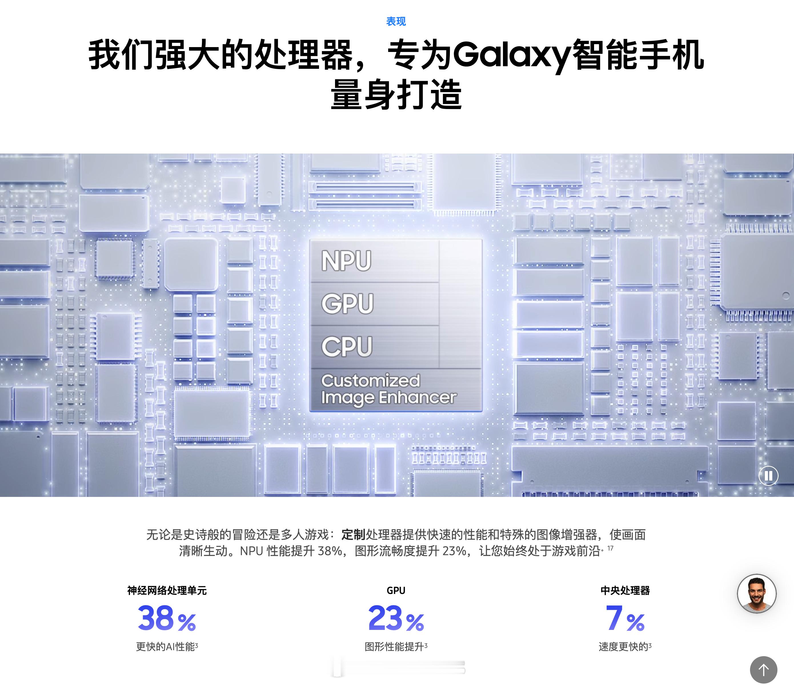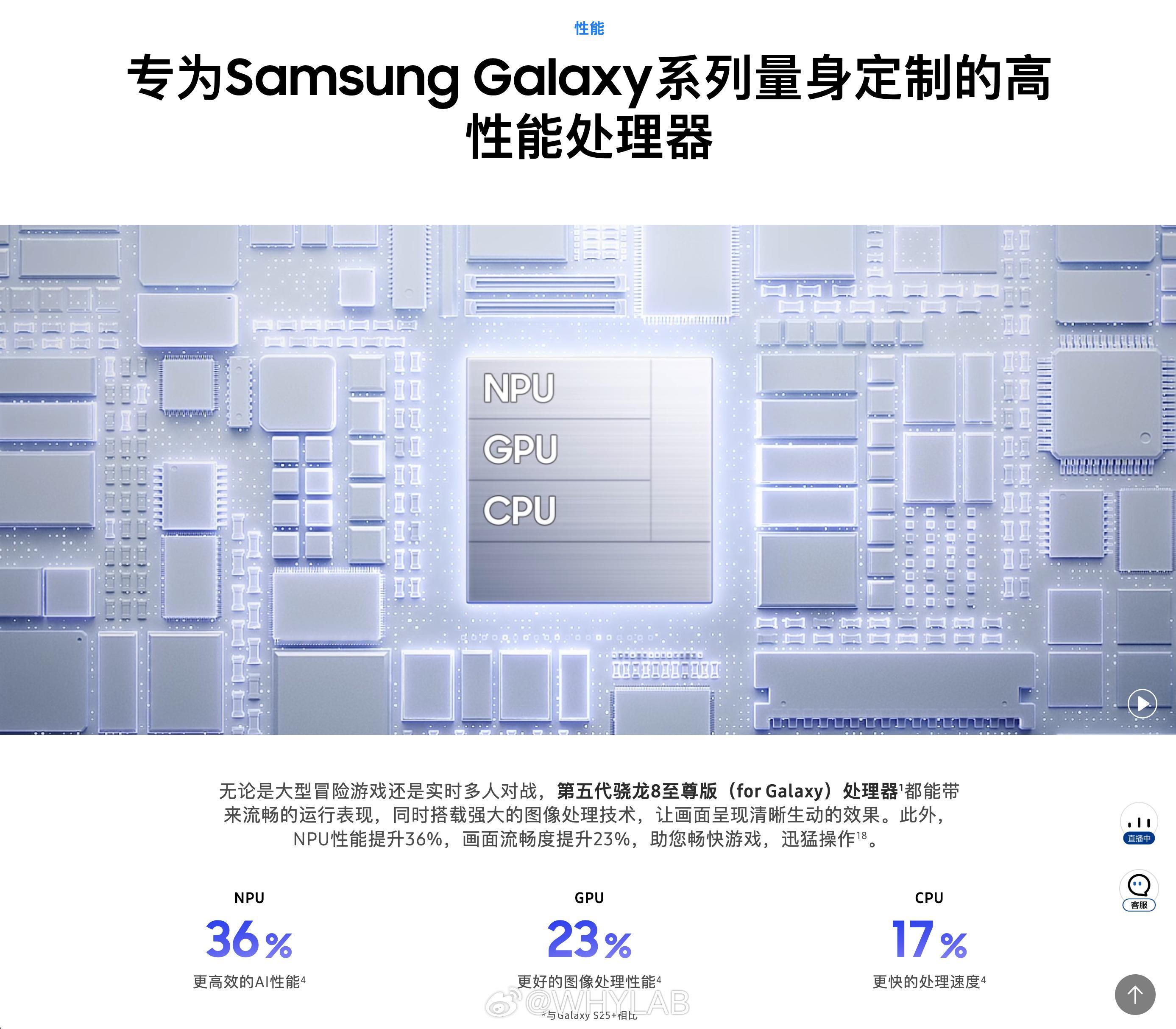 第五代骁龙 8 至尊版 for Galaxy 相比骁龙 8 至尊版 for Galaxy,CPU 性能提升 17%、GPU 能能提升 23%、NPU 性能提升 36%;