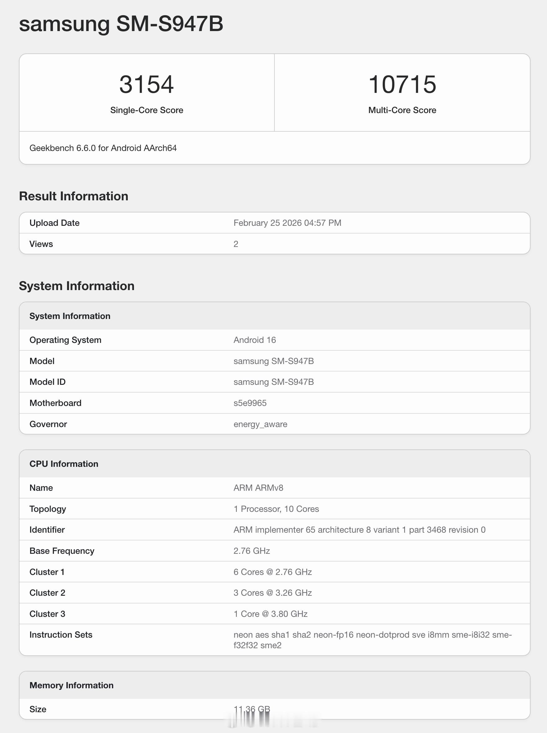 具体表现,Geekbench 6 单核 3154 分,多核 10715 分,单核和多核表现都略弱于第五代骁龙 8 至尊版 For Galaxy 的 S26+;GPU OpenCL 得分 24970 分,和 Adreno 840 成绩相当。