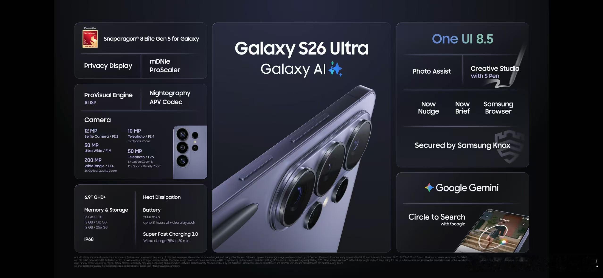 昨晚的三星发布会大家都看了吗?这次Galaxy S26系列新品真的是满满黑科技!全系搭载2nm第五代骁龙八至尊版For Galaxy芯片,NPU性能足足提高了39%,AI反应速度更快也更聪明。Galaxy AI这波可以说是全面进化啊!期待一下上手体验~影像上不仅有2亿像素主摄+双长焦,主摄光圈也升级提升40%进光量,即便是暗光场景也能随手出大片,影像能力大幅提高。还有全球首发的硬件级防窥屏技术,通过像素级光线控制实现硬件级防窥,侧面看直接黑屏,正面观感不受影响。而且还能按场景或应用自定义开启,地铁上看剧也不怕旁边人偷瞄,隐私保护这块是真用心了!三星发布会现场直击你们心动了吗~