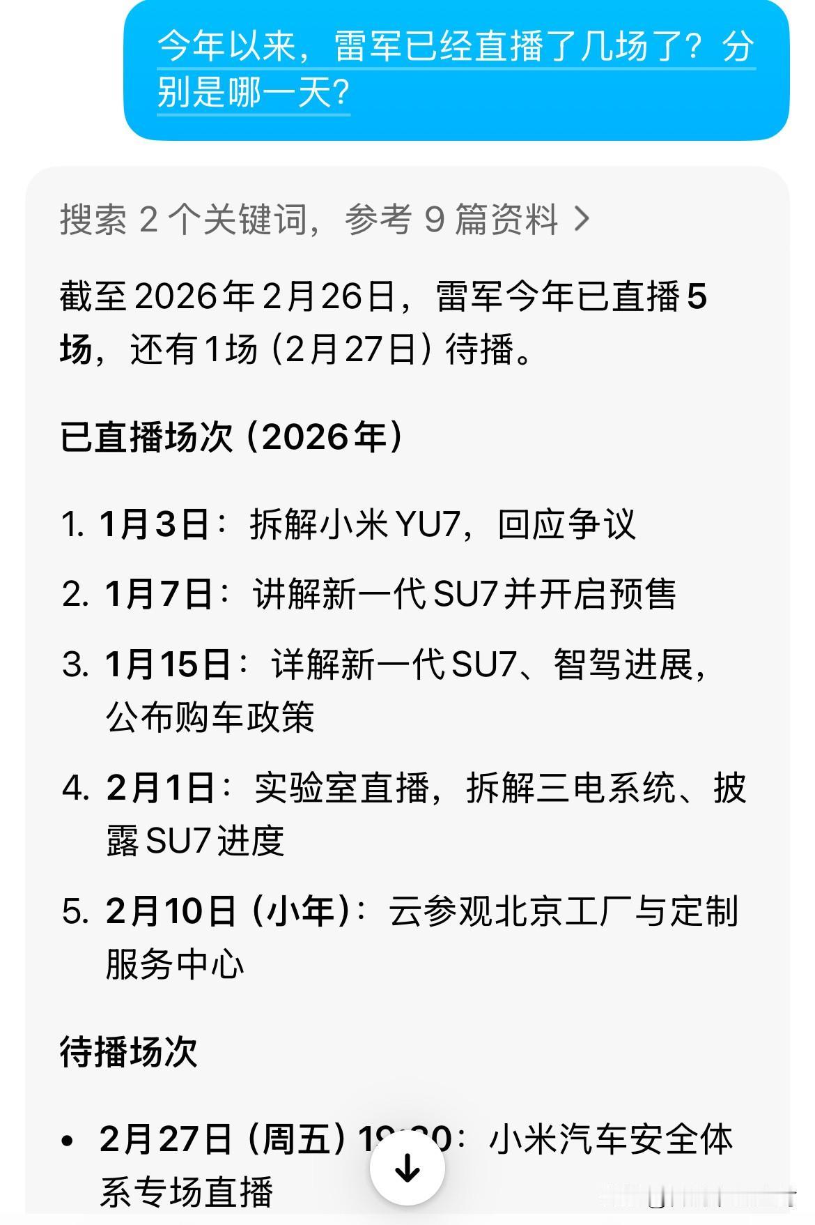 雷军直播再开一场。 这次主题明确,是“关于安全”。 在小米汽车的工厂里,聊小米的安全体系。 时间是27日晚7点半,也就是明天晚上。 看背景图,估计会有车身结构设计与用料的专项讲解?那估计就比较硬核了。 今年以来,雷总的直播频率明显多了起来,然后我特意问了下豆包,将要进行的这场直播将会是今年的第6场。 前面累计已经进行了5场(图二),其中1月3场,2月已进行2场。 不得不说,雷总真的是有够敬业和勤奋的…… 今年无论是新势力还是传统车企,应该都是竞争压力比较大的一年,谁都不敢有丝毫懈怠,都要加倍努力才行啊。