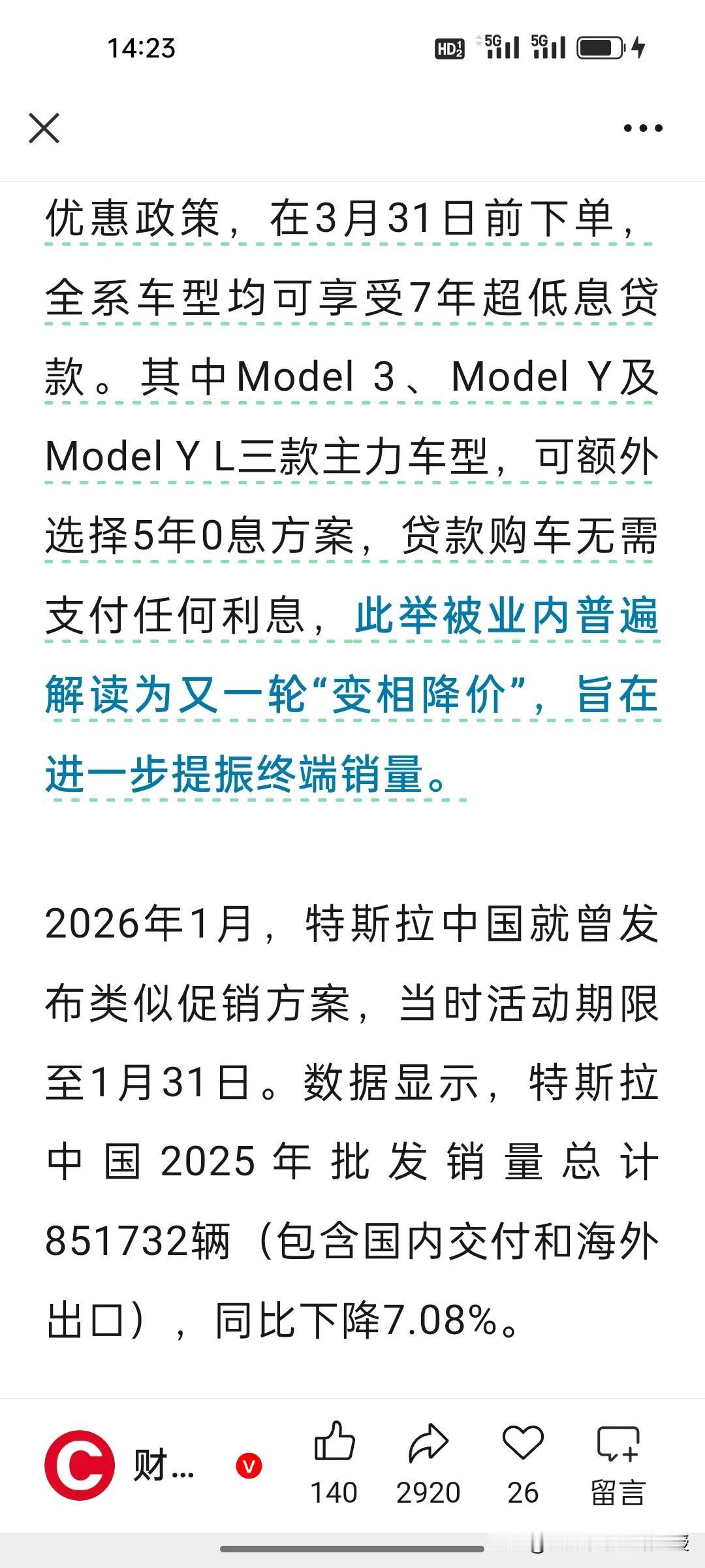 5年0息贷款,特斯拉为了销量使出绝招了! 根据《财联社》报道,面对去年的销量下滑,特斯拉中国使出杀手锏,在3月31日前下单,Model 3/Y/Y L可享5年0息贷款,这波“变相降价”直接将购车门槛完全消失。 不止特斯拉,国内车企也早有动作:比亚迪部分车型推出24/36期0息,小鹏、蔚来针对新用户提供低息甚至免息方案,就连传统车企如吉利、长安也跟进金融优惠,用“钱袋子”撬动销量。 0息贷看着香,实则是车企用利润换市场,其中的风险也不容忽视。但在存量竞争时代,谁能守住用户心智,谁才是最终赢家。汽车行业马年开年以来来,谁也没想到是特斯拉使出绝招,带头卷起来了[捂脸]