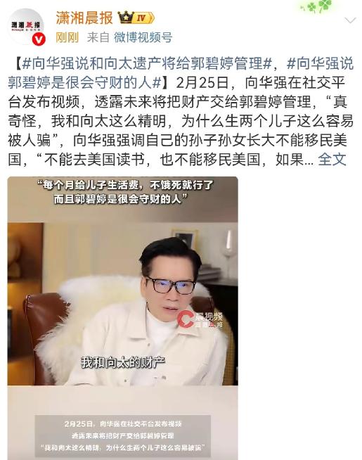 向佐,这下完了! 25日,向华强突然晒出一条视频,没想到,他和向太真的跳过了向佐,将会把百亿遗产交给儿媳郭碧婷打理,还直言郭碧婷是个超会守财的人,而这些话背后其实藏着老两口的无奈。 向佐说过,他见过太多利益交换和虚伪的双面人格,甚至因为父母的身份遭遇过童年霸凌,还反复说“不想变复杂”。 有人共情他身为豪门子弟的身不由己,也有人觉得,他身上少了点豪门继承人该有的沉稳和抗压能力。 而郭碧婷特别有分寸感,自己有稳定的收入,接综艺、开品牌,赚的钱足够支撑自己和娘家的开支,从来不会主动向婆家伸手要补贴。 向太之前在直播里就提过,郭碧婷从来不会乱花钱,给她的钱都会存起来,要么用于孩子的教育,要么打理家里的资产,每一笔开销都算得清清楚楚。 女儿上普通的双语幼儿园,她每天亲自接送,还主动报名做家长义工,帮着老师分点心、打扫卫生,完全没有豪门少奶奶的架子。 其实,不只是向佐,向佑的表现更是让老两口头疼。 向佐虽然比向佑乖巧听话,没有那么多劣迹,但性格里的单纯和容易轻信他人,也是硬伤。 可能有人会觉得,向华强夫妇这样做太绝情,毕竟是自己的亲生儿子,怎么能直接跳过他们把遗产交给儿媳? 向太年轻的时候,一个人扛起家庭责任,帮着向华强打拼出如今的商业版图,深知财富积累的不易,自然不想让心血付诸东流。 现在再看向佐,虽然在直播带货上做出了一些成绩,也尝试摆脱“向华强儿子”的标签,但在父母眼里,他依然没有足够的能力打理家产。 毕竟直播带货和管理家族遗产是两回事,前者有团队加持,后者需要足够的沉稳、眼光和理财能力。 而这些,恰恰是向佐目前欠缺的。 向华强的那条视频,没有指责,没有抱怨,只有对郭碧婷的认可和对儿子们的无奈。 目前,全网都在讨论这件事,有人羡慕郭碧婷得到了公婆的绝对信任,有人为向佐感到惋惜,也有人觉得这是豪门家庭的必然选择。 而向佐接下来的路该怎么走,能不能凭借自己的能力证明自己,摆脱“扶不起的阿斗”的标签,或许只有时间能给出答案。 毕竟在豪门里,能力永远比身份更重要,想要得到认可,终究还是要靠自己的实力说话。 对于这件事,您有什么想说的吗?欢迎评论区留言讨论。 信息来源:潇湘晨报