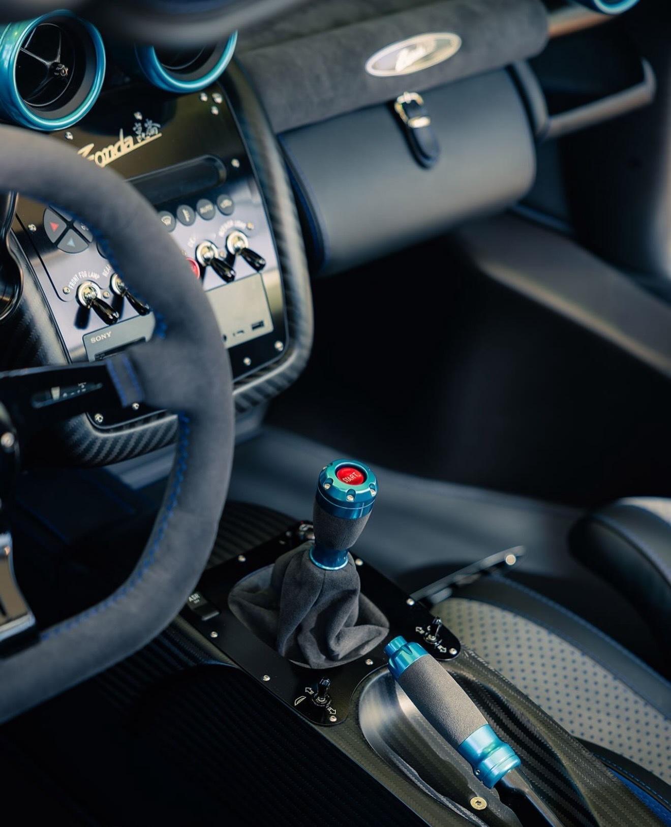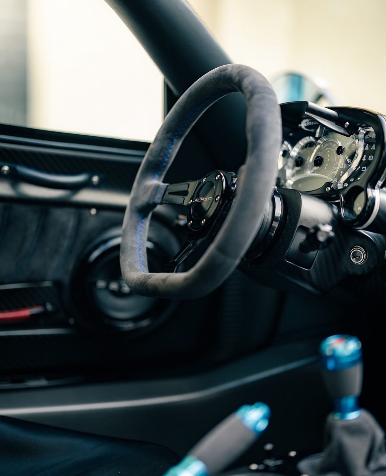 此例采用较浅的蓝色碳纤维涂装,配备黑色轮毂,蓝色刹车卡钳,白色和碳纤维外饰件,以及黑色alcantara材质和灰色皮革内饰,搭配蓝色走线。