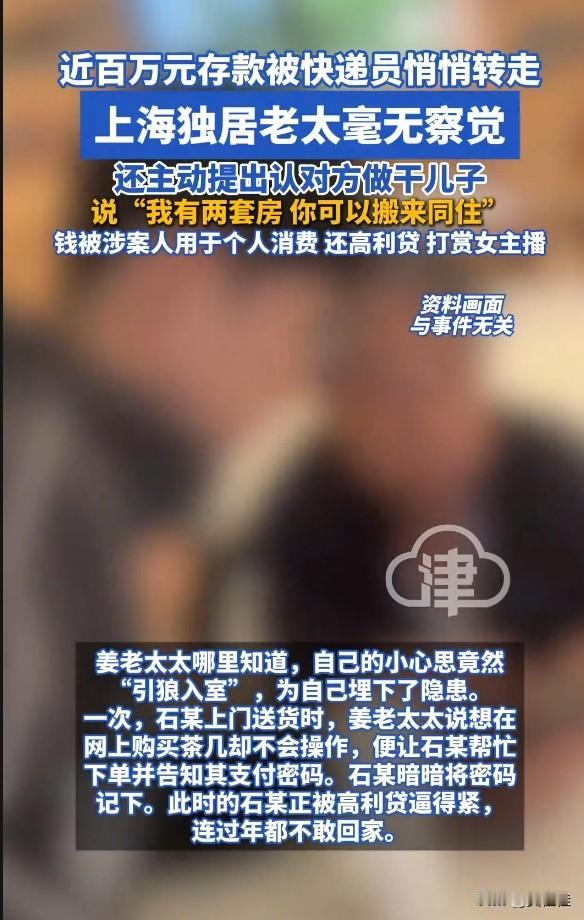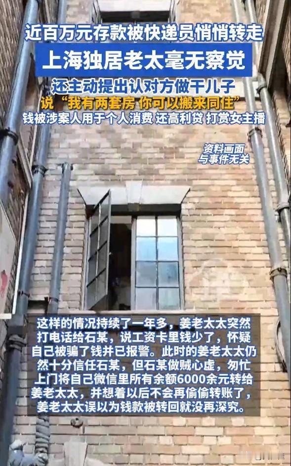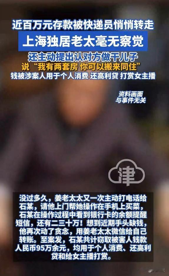 80岁独居老太认快递员当干儿子,还主动说“我有两套房,你搬来住”,结果近百万存款被悄悄转光,自己到报警时还在护着他! 独居老太认快递员做干儿子,差点赔光一生积蓄!上海80多岁的姜奶奶,身边没亲人陪伴。常来送货的快递员石某,偶尔搭把手,就让老人动了真情。她不仅给零钱零食,还主动提出认干儿子,甚至要让对方搬去自己的两套房同住。 可这份真心,换来的却是算计。姜奶奶让石某帮忙网购,随口告知支付密码,竟成了引狼入室的祸根。石某被高利贷逼得紧,先转0.1元试探,见老人没察觉,胆子越来越大。从一两千到一两万,一年多时间,他陆续转走95万,全花在还高利贷、打赏女主播上。 直到老人发现工资卡少钱报警,还依然信任石某。石某只转回6000多元,就想蒙混过关。这件事给所有人提了个醒:独居老人的孤独,别成了骗子下手的突破口。家里有老人的,一定要反复叮嘱,支付密码绝不能告诉外人,哪怕对方看着再靠谱!