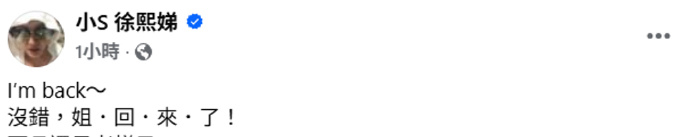 小S复工更新小S说姐回来了 26日,小S在社交平台更新,分享自己代言的品牌广告,