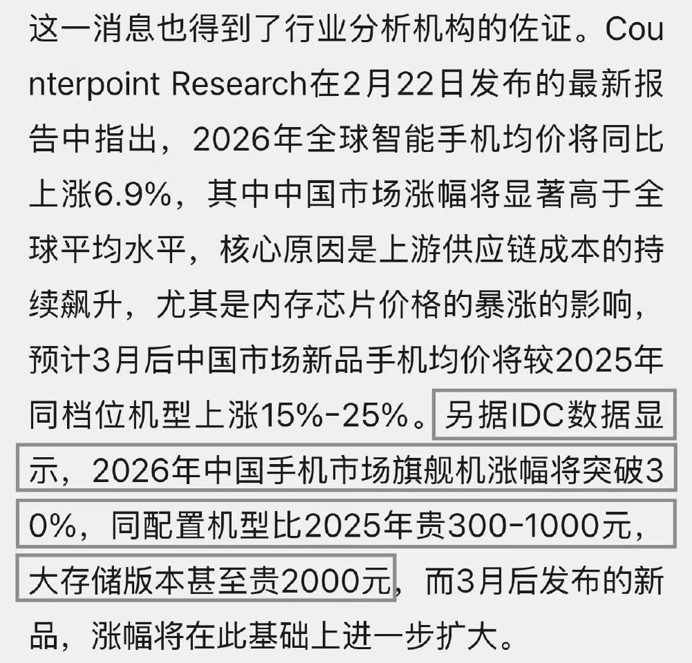 背后核心原因是存储芯片成本飙涨,自2024年下半年触底后,芯片价格就一路涨,2026年初涨势更猛,现在采购成本比去年同期高了超80%,还没停下的意思。
