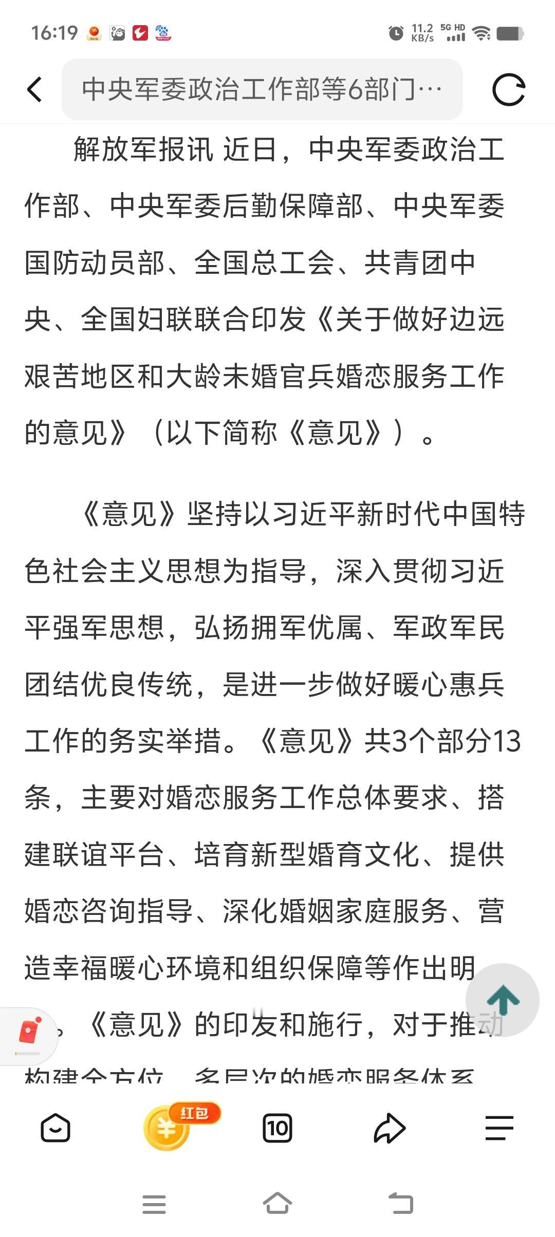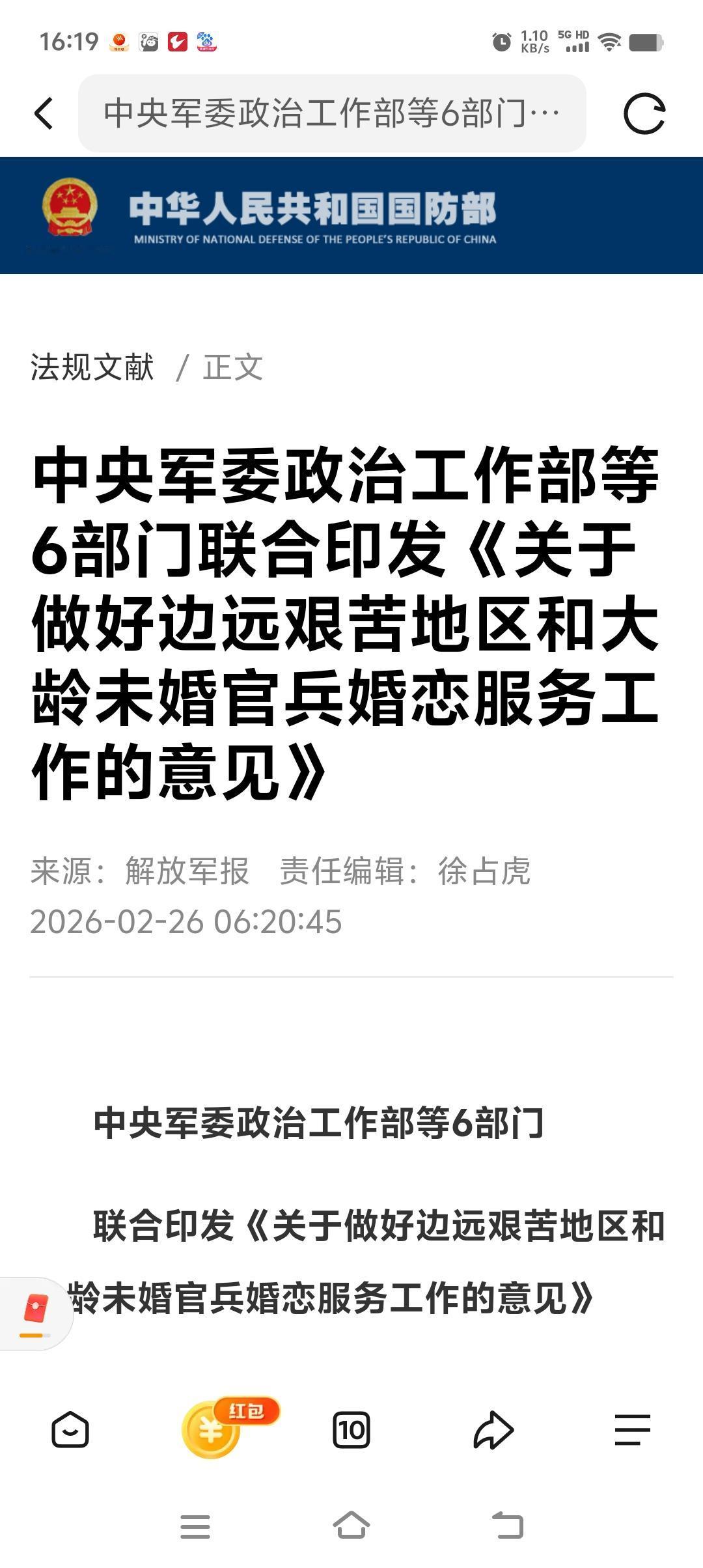 国家为官兵“脱单”指路:婚恋服务新政,战力的背后基石 2026年2月26日,中央军委政治工作部、中央军委后勤保障部、中央军委国防动员部、全国总工会、共青团中央、全国妇联六部门联合印发《关于做好边远艰苦地区和大龄未婚官兵婚恋服务工作的意见》,文件共3部分13条,面向边远艰苦地区部队、长期驻训执勤、任务繁重及大龄未婚官兵群体,构建全链条婚恋服务体系。本文基于权威发布,系统梳理政策核心内容,阐释其政治意义、强军意义、社会意义与法治意义,明确政策对稳定军心、凝聚战力、巩固军政军民团结的关键作用。 一、政策出台背景与核心现实依据 军人职业具有驻地偏远、任务繁重、社交受限、长期分居等特殊性,边远艰苦地区官兵更面临地理隔离、婚恋渠道狭窄、家庭团聚困难等现实困境。大龄未婚、婚恋焦虑已成为影响官兵安心服役的突出问题。党中央、中央军委始终坚持以兵为本,聚焦官兵急难愁盼,推动军地协同破解现实难题。本次六部门联合发文,是继《军队人员婚姻管理若干规定》修订后,军队与地方群团系统协同推进军人权益保障的制度化举措,兼具现实针对性与长期指导性。 二、《意见》核心内容与制度举措 《意见》坚持以习近平新时代中国特色社会主义思想为指导,围绕总体要求、服务举措、组织保障三大板块作出系统安排,核心举措可归纳为五大维度: 一是搭建常态化联谊平台。依托工会、共青团、妇联基层网络,军地联合开展线上线下联谊交友、婚恋推介活动,拓宽官兵社交渠道,破解“圈子小、接触少”难题。 二是培育新时代婚育文化。加强婚恋观、家庭观教育,引导官兵树立正确婚恋理念,弘扬拥军优属、爱国爱家、忠诚担当的优良家风。 三是提供专业婚恋咨询指导。建立心理疏导、情感沟通、婚恋法律咨询服务机制,针对择偶、相处、矛盾调解等环节提供专业支持,提升家庭经营能力。 四是深化婚姻家庭全周期服务。覆盖恋爱、结婚、家庭维系、家属随军、探亲保障、子女照料等环节,完善来队住房、生活设施、托幼服务等硬件配套,改善团聚条件。 五是强化军地协同组织保障。明确军队政治工作、后勤保障、国防动员部门与地方群团组织职责分工,建立统筹协调、资源共享、督导落实机制,确保政策落地见效。 政策突出精准覆盖、军地联动、全链服务、务实暖心,把“牵线搭桥”与“护航家庭”结合,把情感服务与权益保障结合,把个体幸福与强军事业结合。 三、政策重大意义:从暖心工程到战斗力工程 (一)政治意义:彰显以人民为中心与依法治军理念。《意见》是党中央、中央军委关心关爱基层官兵的具体体现,将官兵婚恋家庭这一“民生小事”上升为强军事业“政治大事”,以制度化形式固化暖心举措,完善军人权益保障制度体系,增强官兵政治认同、组织认同与职业认同。 (二)强军意义:稳定军心、凝聚战力,筑牢备战打仗根基。家庭稳定是军心稳定的基础,军心稳定是战斗力生成的前提。《意见》从根源上解除官兵后顾之忧,让官兵安小家、守大家,心无旁骛投身练兵备战,把暖心惠兵转化为练兵动力与战斗意志,对巩固边防、稳定队伍、提升部队凝聚力战斗力具有不可替代作用。 (三)社会意义:厚植拥军优属传统,巩固军政军民团结。六部门联合发文实现军队系统与地方群团组织资源整合,拓宽拥军优属渠道,让社会更理解军人、尊重军人、支持军人家庭。政策引导全社会树立尊崇军人、关爱军属的价值导向,以家庭和谐促进社会和谐,彰显军政军民团结的政治优势。 (四)人文意义:保障军人家庭幸福,促进官兵全面发展。政策回应官兵对幸福生活、家庭圆满的合理追求,体现组织温度与人文关怀,缓解心理压力与现实困扰,促进官兵身心健康。稳定和睦的家庭有利于官兵长期服役、安心尽责,实现个人价值与强军使命同频共振。 (五)长远意义:完善军人保障体系,吸引保留优秀人才。婚恋家庭保障是军队吸引力、凝聚力、向心力的重要组成。健全婚恋服务体系有利于稳定基层骨干、吸引优秀青年参军入伍、保留高素质人才长期服役,夯实军队建设人才基础,对建设世界一流军队具有长远战略价值。 四、政策落实导向与实践要求 《意见》强调务实落地、常态长效,要求各级压实责任、军地协同、精准服务、注重实效,杜绝形式化、运动化。军队各级聚焦基层一线、边远艰苦岗位,细化配套措施;地方群团组织发挥组织优势、网络优势、服务优势,主动对接、常态推进;全社会共同参与,营造尊崇军人、关爱军属的良好氛围,把政策红利转化为官兵获得感、幸福感、安全感,转化为卫国戍边、强军兴军的实际行动。 综上所述,六部门联合印发《意见》,是新时代强军事业中暖心惠兵的制度创新、军地协同的实践突破、战斗力建设的基础支撑。政策既解决官兵婚恋现实难题,更关乎军心稳定、国防巩固、军地团结;既彰显组织温度,更承载强军使命。全面落实,必凝心聚力、厚植根基,激励官兵忠诚履职,为实现新时代强军目标贡献更大力量。