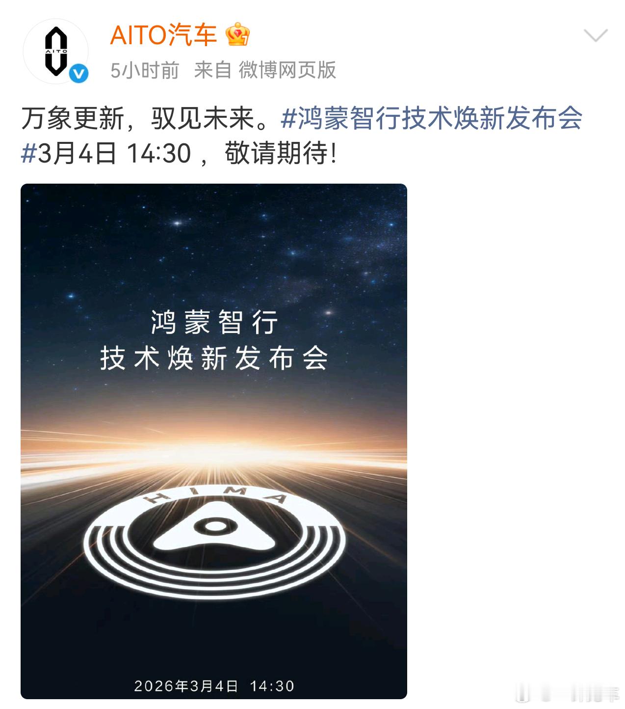 鸿蒙智行技术焕新发布会定档3月4日大家有没有留意到,鸿蒙智行“五界”官号中只有尊界和问界发了技术焕新发布会的预告。结合之前的信息,大家猜到是为什么了吗?华为开年发布会时间官宣