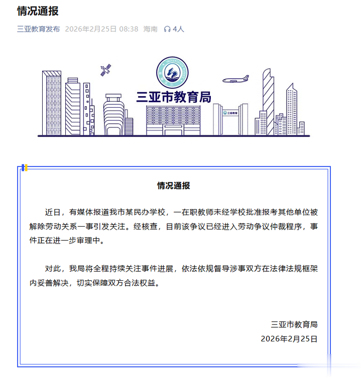 近日,海南三亚中学一名老师被曝因参加其他单位招考遭校方开除,此事引发关注。2月25日,三亚市教育局发布情况通报称,经核查,目前该争议已经进入劳动争议仲裁程序,将全程持续关注事件进展,依法依规督导涉事双方在法律法规框架内妥善解决,切实保障双方合法权益。